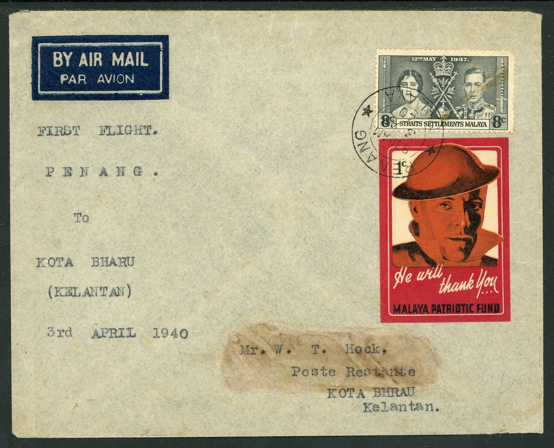 1940 (3 Apr.) envelope from Penang to Kota Bharu, marked "First Flight 3rd April 1940", franked at 8c. and additionally bearing 1c. Malaya Patriotic Fund label, showing arrival datestamp (3.4) on reverse