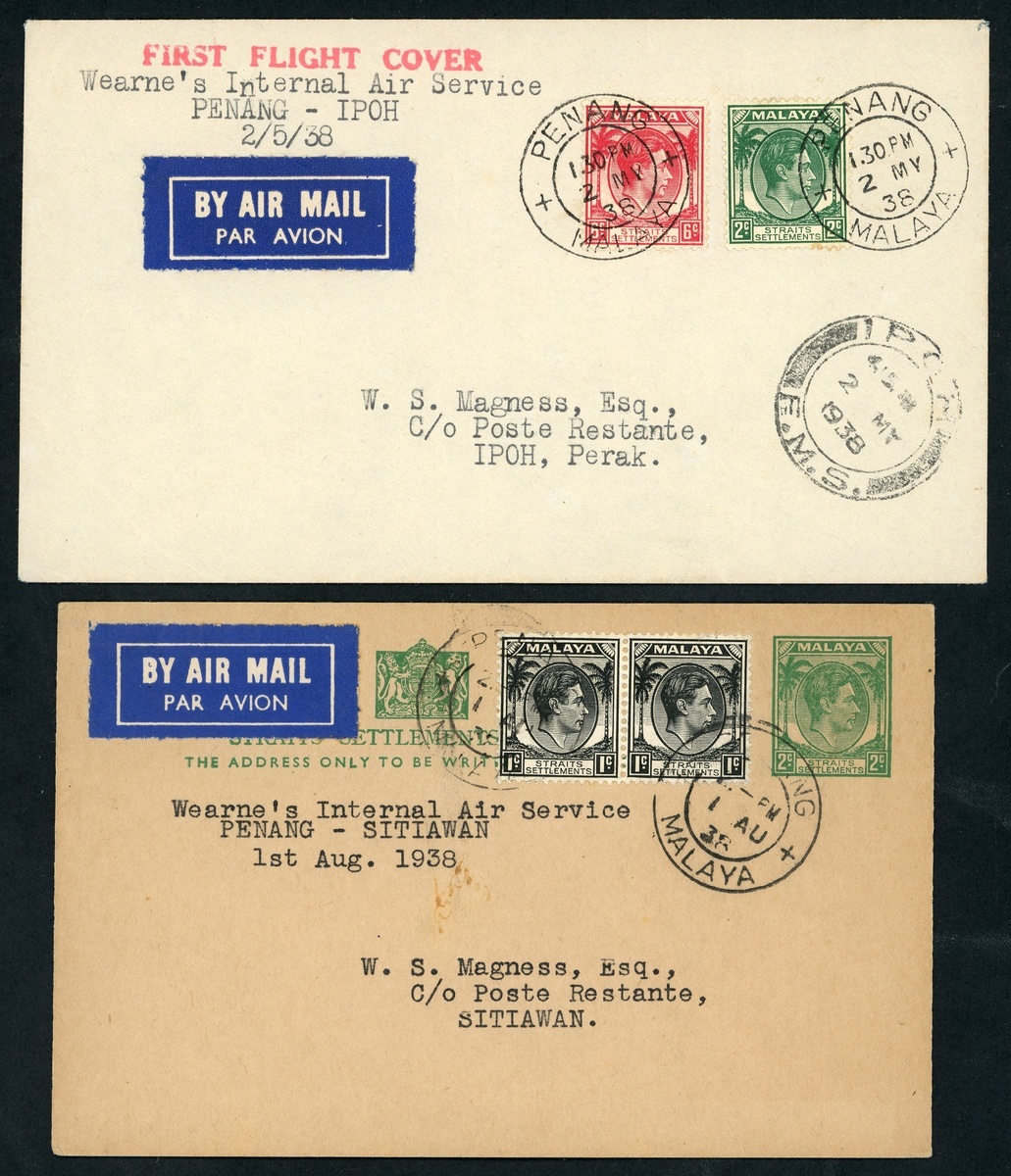 1938 (2 May) envelope from Penang to Ipoh, marked "Wearne's Internal Air Service, Penang - Ipoh", franked at 8c. and showing clear arrival datestamp (2.5); and 1938 (1 Aug.) Straits Settlements 2c. stationery card from Penang to Sitiawan, marked "Wearne's Internal Air Service, Penang - Sitiawan" and uprated 2c. A fine pair