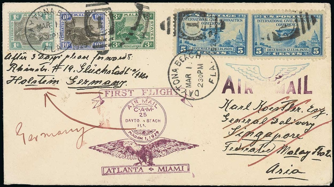1929 (1 Mar.) envelope addressed to Singapore, franked with US 5c. (2) and Federated Malay States 1c., 3c. and 10c., all tied by Dayton Beach duplex, flown on first Atlanta-Daytona-Miami service, operated by Pitcairn Aviation, then taken by surface to Singapore, showing special flight cachet in purple with Singapore datestamp (3.4) on reverse. Unusual. Photo