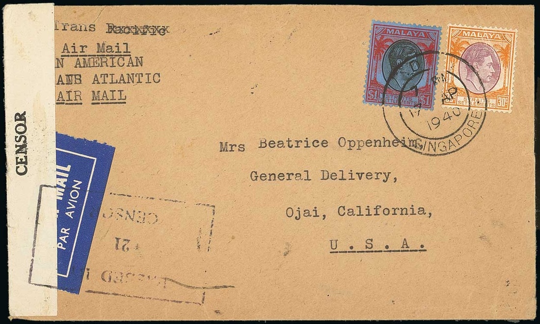 1940 (17 Apr.) envelope from Singapore to California, marked "Pan American Trans Atlantic Air Mail", franked at $1.30 (30c. stamp creased) and showing Censor label at left tied by framed "passed by/21/censor". Scarce, about ten covers recorded at this rate. Photo