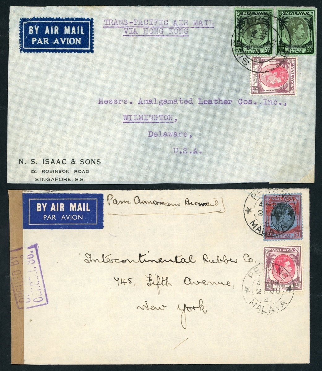 1941 (5 Mar.) envelope from Singapore to Delaware, marked "Trans-Pacific Air Mail via Hong Kong" and franked at $1.40; and 1941 (21 June) envelope from Penang to New York, marked "Pan American Airmail", franked at $1.40, showing brown sealing tape at left tied by Censor handstamp