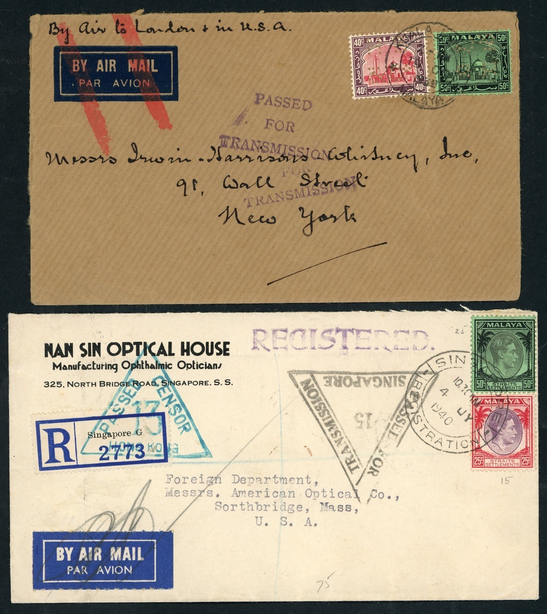 1939 (10 Oct.) envelope from Kuala Lumpur to New York, marked "By Air to London & in USA", franked at 90c. (Selangor 40c. and 50c., both with "h b &co" perfin) and showing unframed "passed/for transmission" in violet; 1939 (25 Nov.) envelope from Singapore to New Jersey, franked at 90c. and showing unframed "passed/for/transmission" in black; 1940 (18 Apr.) envelope from Singapore to New York, marked "By Air to London only" and showing triangular "passed for transmission/49/singapore" in violet; and 1940 (4 July) envelope registered from Singapore to Massachusetts, franked at 75c., showing triangular "passed for transmission/15/singapore" in black, and blue-green Hong Kong censor cachet