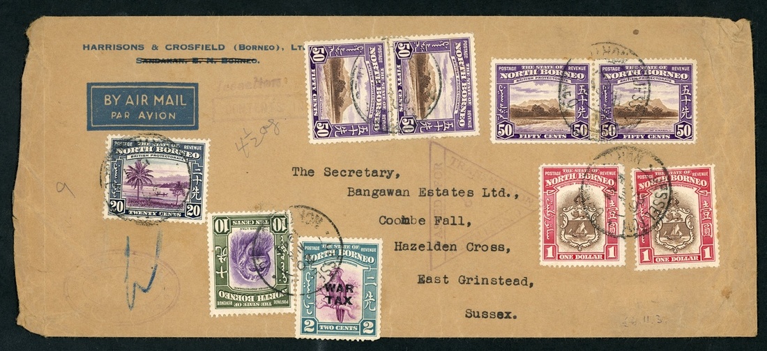 1941 (20 Aug.) envelope (235x100mm.) from Jesselton to England, marked "4½oz", franked at $4.95 plus 2c. War Tax paying nine times the 55c. rate, showing light triangular "passed for transmission/north borneo"; the envelope with some creases