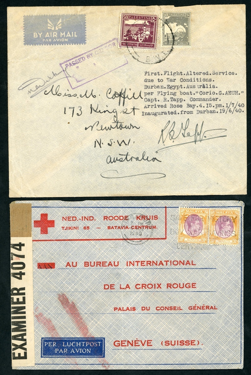 1940 (19 June) envelopes (2) to Sydney, one from Singapore franked at 55c., the other from Palestine franked at 60m., both marked "First Flight. Altered Service due to War Conditions. Durban via Egypt to Australia per flying boat 'Corio' G-AEUH", showing Censor cachets and signed by the pilot, Capt. R. Tapp; 1940 (7 Sept.) 2c. stationery card from Singapore to England, uprated28c. and showing Censor cachet; 1940 (30 Sept.) envelope from Singapore to Switzerland, franked at 60c., showing Censor label (partly removed) and cachet; 1940 (5 Nov.) Netherland Indies Red Cross envelope from Singapore to Switzerland, franked at 60c. and showing Censor label; and 1941 (3 May) envelope from Kuala Lumpur to Dublin, marked "On Active Service", franked at 55c. and cancelled with F.P.O. 29 datestamp and showing violet Censor cachet