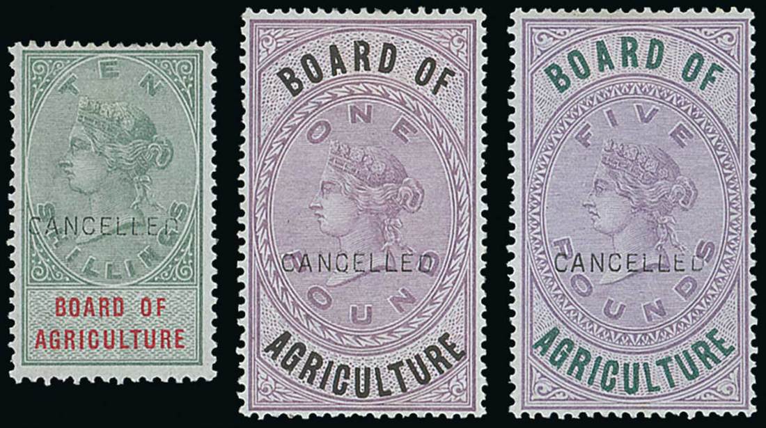1889 1/- to £5 set of six, overprinted "cancelled", superb mint with beautifully fresh white gum. A very rare set, particularly with Cancelled rather than Specimen overprint. Photo
