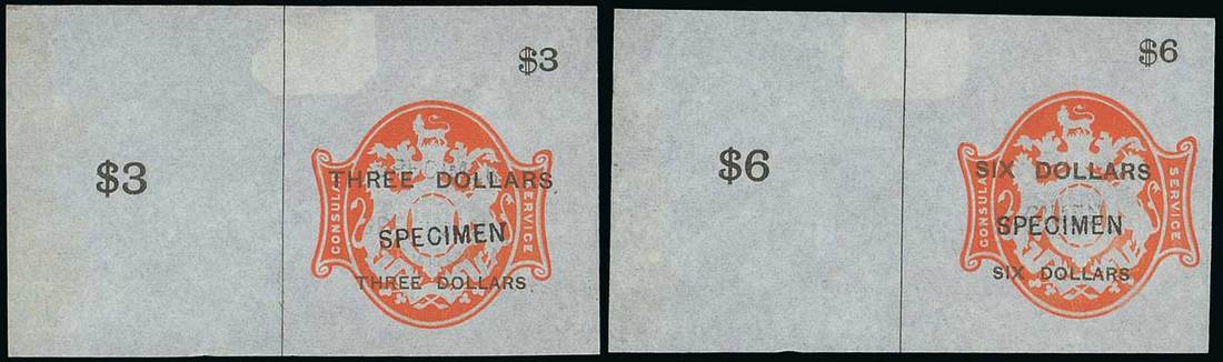 1885 25c. to $6, seven imperforate trial impressions (25c., 50c., $1, $1½, $2, $3, $6) in red each with counterfoil and overprinted "specimen" the face values in an unissued font and all without serial number. Rare and most unusual. Photo