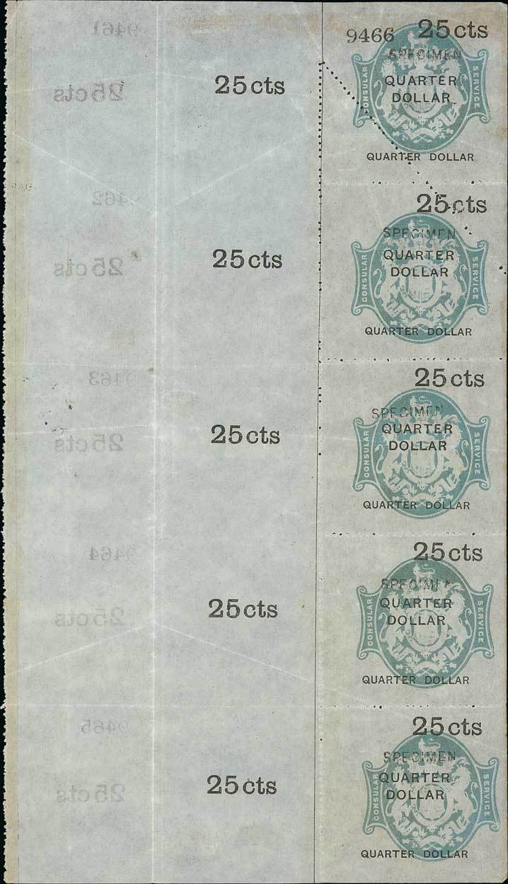 1885 denominated in dollars, 25c. grey-blue, complete booklet pane plus counterfoils from the preceding pane, on gummed paper, each stamp overprinted "specimen", and showing a perforation error caused by a paper fold, only the top stamp shows a serial number (9466) with the counterfoils blank, the counterfoils from preceding page correctly numbered 9461-9465. Extremely rare being one of only a handful of recorded complete panes, and particularly desirable to demonstrate the difficulty of printing the complex numbered booklets used for this issue.