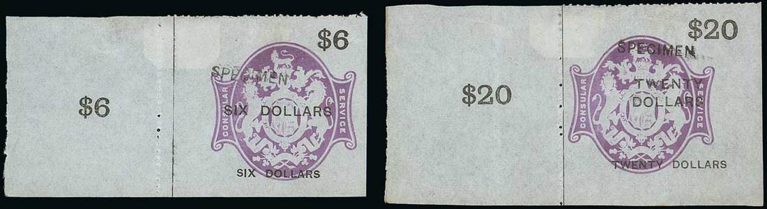 c.1885 denominated in dollars, 25c. to $20, complete set of ten overprinted "specimen", all perforated but without serial numbers, each design as issued. Odd minor faults (creasing, rough edges) though a fine and rare complete set. Photo