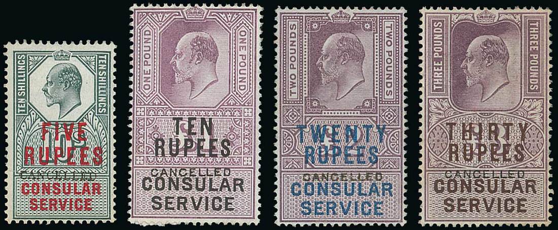 1906 Surcharged in Rupees 4a. on 3d. to 30r. on £3 set of ten, overprinted "cancelled", unused, a few values with fragments of appendix sheets adhered to reverse. A very rare set, with most recorded usage taking place in Zanzibar. Photo