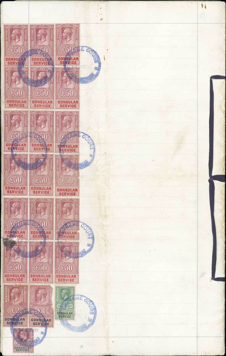 1939 (14 July) complete probate document bearing £50 Claret and Vermilion (20) with 1/- green and 6d. claret and green for a remarkable total franking of £1000/1/6, cancelled with neat "supreme court/ shanghai" undated c.d.s. in blue on reverse page, the interior pages detailing property and shares owned by the Deceased William Alfred Morling, with handstamps of the various companies and organisations in which he owned a stake. A fascinating piece of Shanghai's history, and a remarkably high franking. Photo.