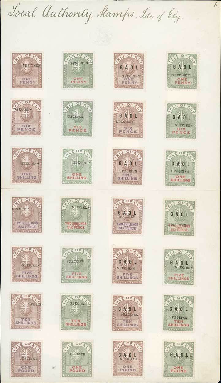 c.1878 sheet from presentation album bearing complete sets of seven, (4) overprinted "specimen" arranged in columns, comprising 1870 brown and violet, and 1882 green and carmine, and both sets overprinted gaol, all fine fresh mint, each stamp gummed by top edge to sheet. An attractive and very rare presentation sheet, the GAOL sets seldom seen. Photo