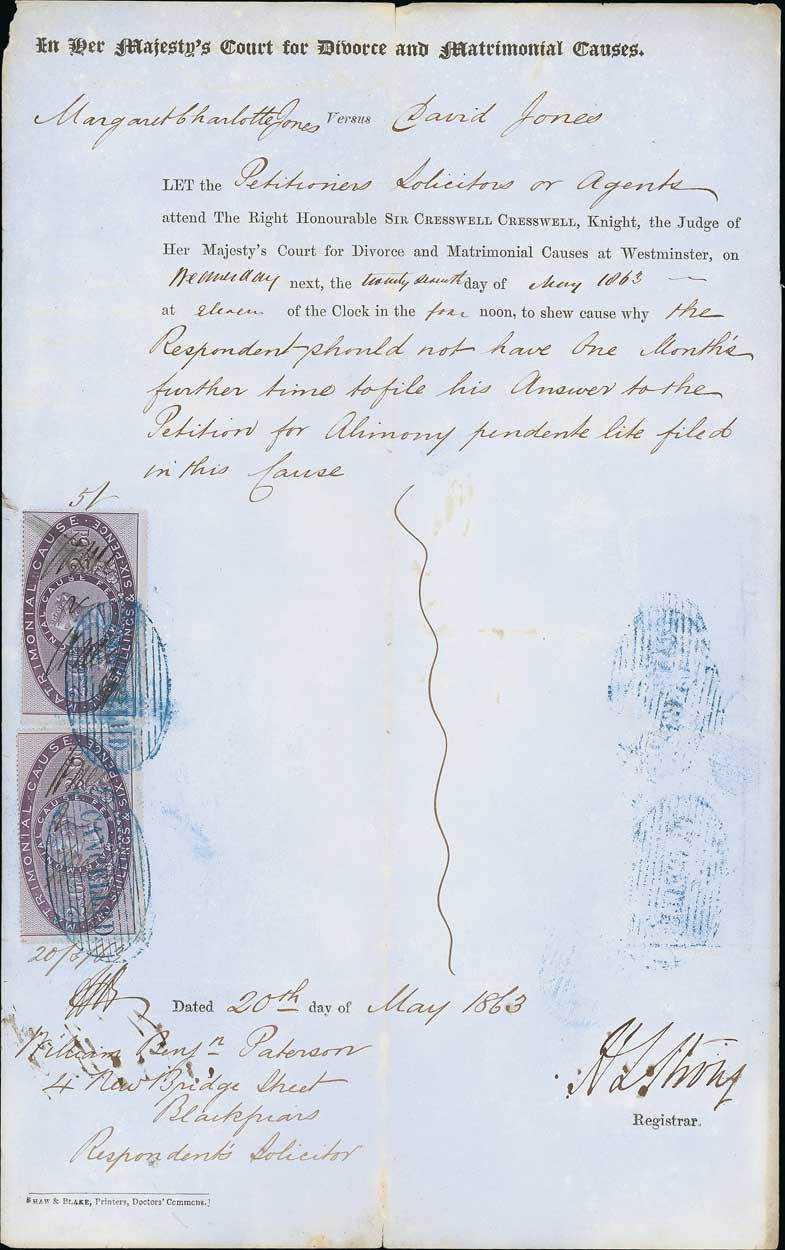 1863 (20 May) Petition for Alimony between David and Margaret Charlotte Jones bearing 1858 2/6d. lilac (2) each tied by blue "cancelled" in barred oval, central filing fold and slight ageing to paper, not detracting from this excessively rare usage; at the time divorce proceedings were most unusual- only 134 divorces were granted in the whole of Great Britain in 1863. Photo