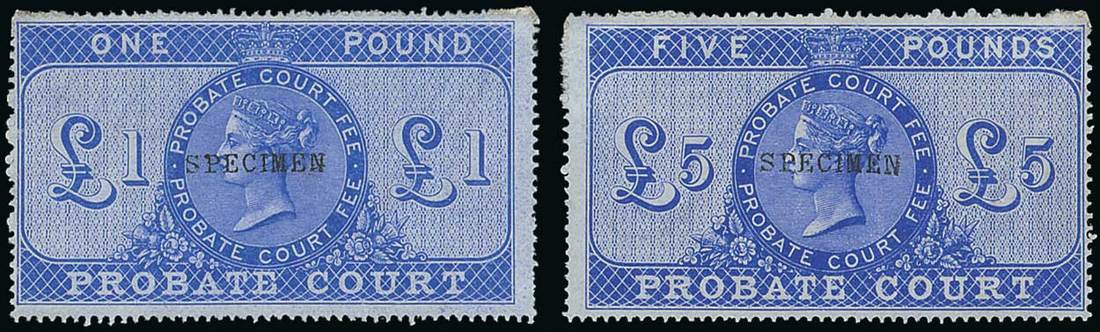 1860 3d. to £5 set of eight overprinted "specimen" type 9, fresh mint, chiefly fine though a few with perforation faults. A scarce set which had a huge impact on the appearance one of Britain's most iconic postage stamps; the £5 orange would have been printed in ultramarine but for the fear of confusion with the £5 probate stamp in this set. Photo