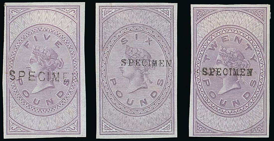 Selection of Queen Victoria imperforate plate proofs (45), with values from 1d. to £20, ten values from 1/- to £1 on surfaced "safety", showing the usual surface rubbing characteristic of this manifestly unsuitable paper, the remainder largely fine to very fine, with fresh colour and four margins, some duplication of values though an attractive and scarce group rarely offered in this quantity. Photo