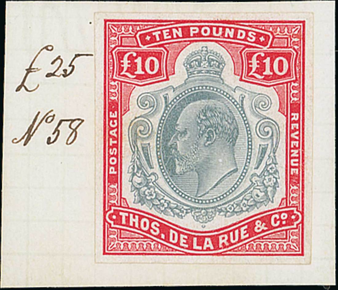 Third Universal Colour Scheme, 31 January 1908 De La Rue £10 in green and red on piece marked "£25 No. 58". in manuscript. Photo