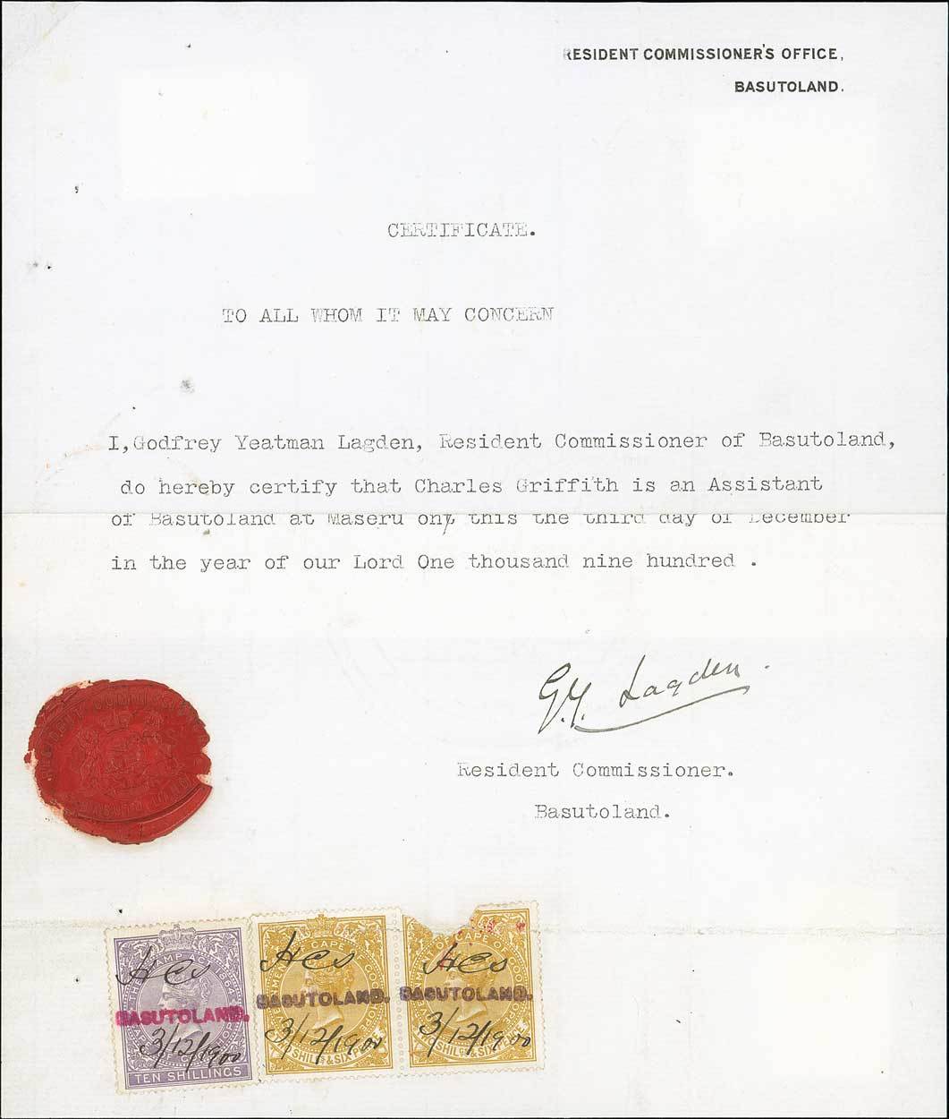 1900 (3 Dec.) authorised certificate bearing Series 5 2/6d. Olive-Bistre (2, horizontal pair), and 10/- grey-lilac, cancelled by manuscript date and initials, filing fold running through the top of all 3 stamps (though 10/- only mildly affected), and the right 2/6d. defective with piece missing at top, still an extremely rare document, according to Trotter and Midwood's guide the earliest recorded from the colony.