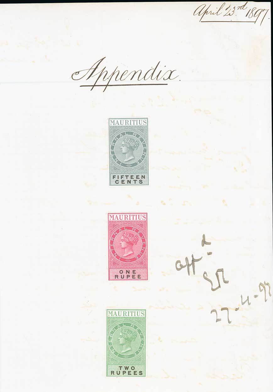 1897 De La Rue Appendix sheet dated "April 23rd. 1897." bearing three imperforate colour trials, of 15c. grey and black, 1r. red and black and 2r. green and black, marked " appd. ER/ 27-4-97", the revised colour shceme issued 1897, accompanied by a copy of the requisition which ordered the stamps, with printing quantities for all values 15c. to 2r., the letter stating "You will notice that the colours of the 15 cents, + one + two Rupee stamps are to be changed..." A unique archival record, particularly desirable with the detailed correspondence. Photo.