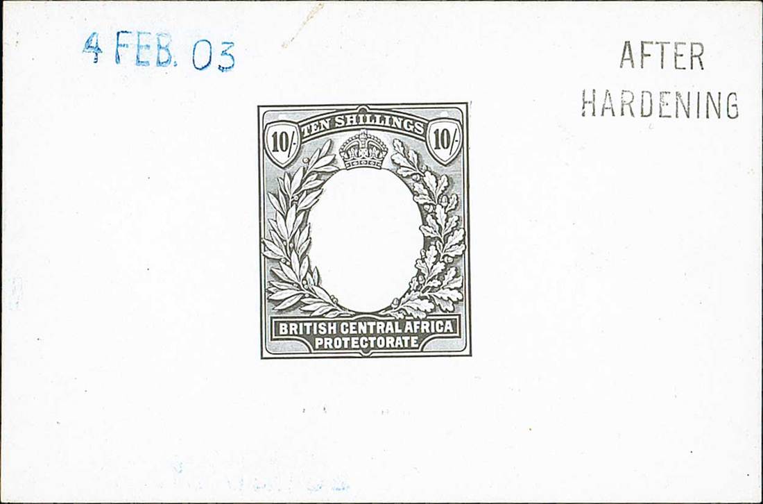 10/- die proof of frame marked "after hardening" at upper right and dated "4 feb. 03". Fine. Photo
