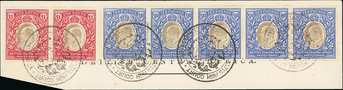 1903-04 £10 grey and blue, horizontal strip of five with £1 grey and carmine horizontal pair, all tied to British Central Africa document header by "her majesty's high court/ british central africa" handstamps with coat of arms in centre. Choice quality; a superb showpiece and the largest recorded multiple of this handsome and popular high value. Photo