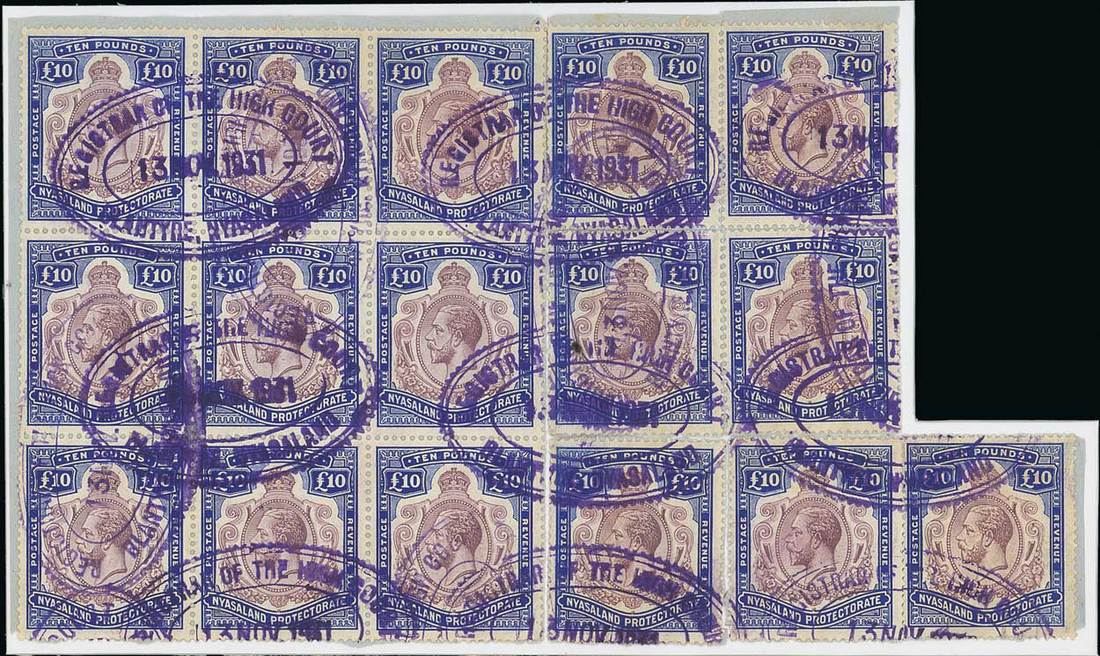 1913-21 £10 purple and royal blue, sixteen examples, used on probate document, the block divided into a block of nine and seven singles (presumably for sale) before being reunited and mounted in place as offered here. Rare multiple usage, the intact block of nine particularly desirable. Photo.