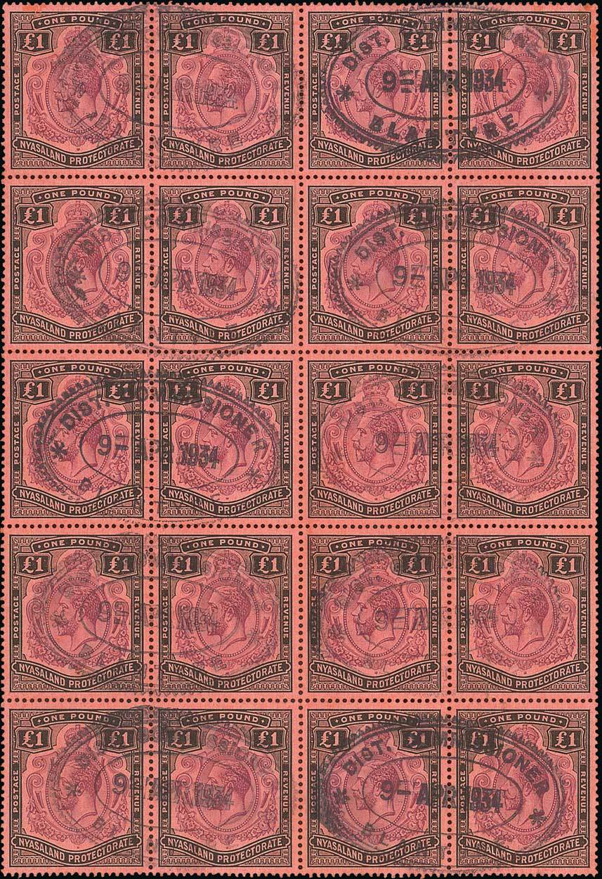 1913-21 £1 purple and black/red, block of twenty (4x5) very fine used, each horizontal pair cancelled by "district commissioner/ blantyre" oval h.s. dated "9 apr 1934", visually spectacular and almost certainly the largest surviving used multiple. Photo