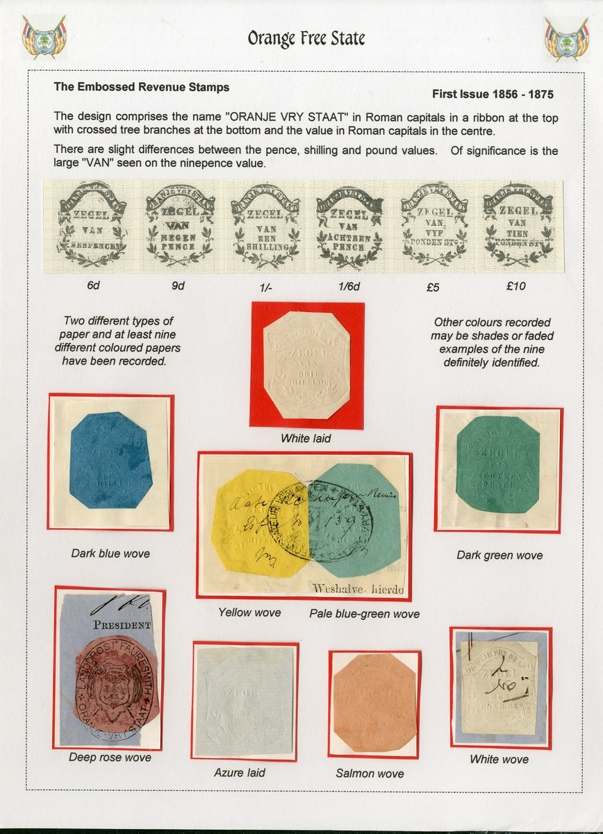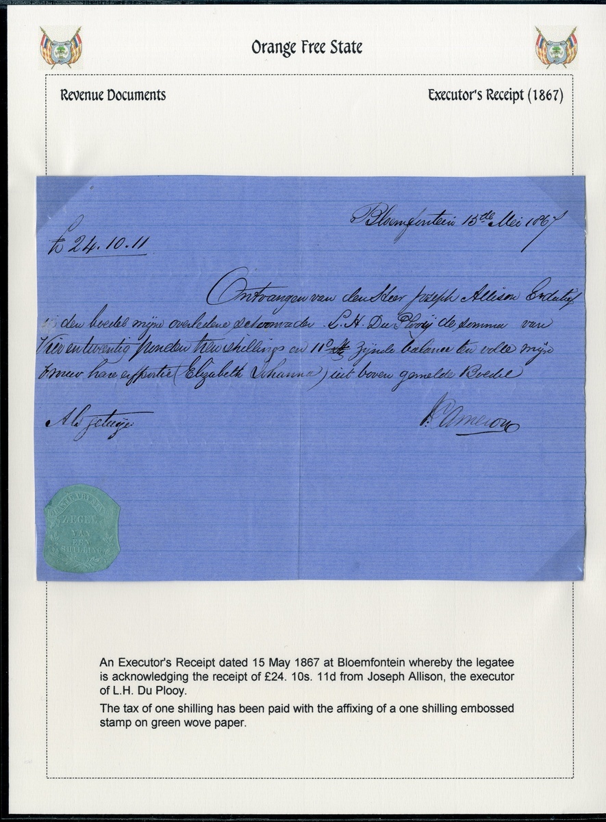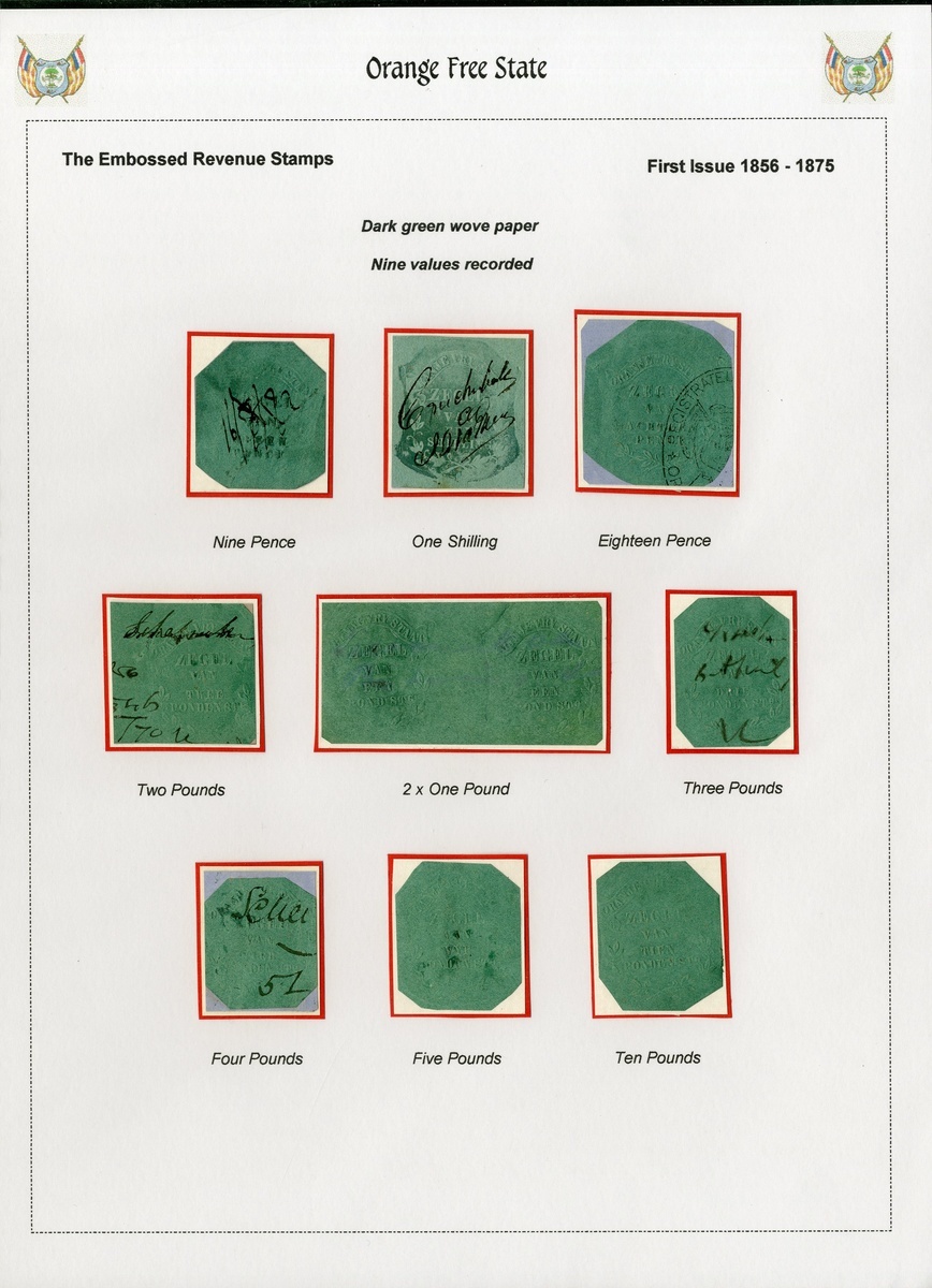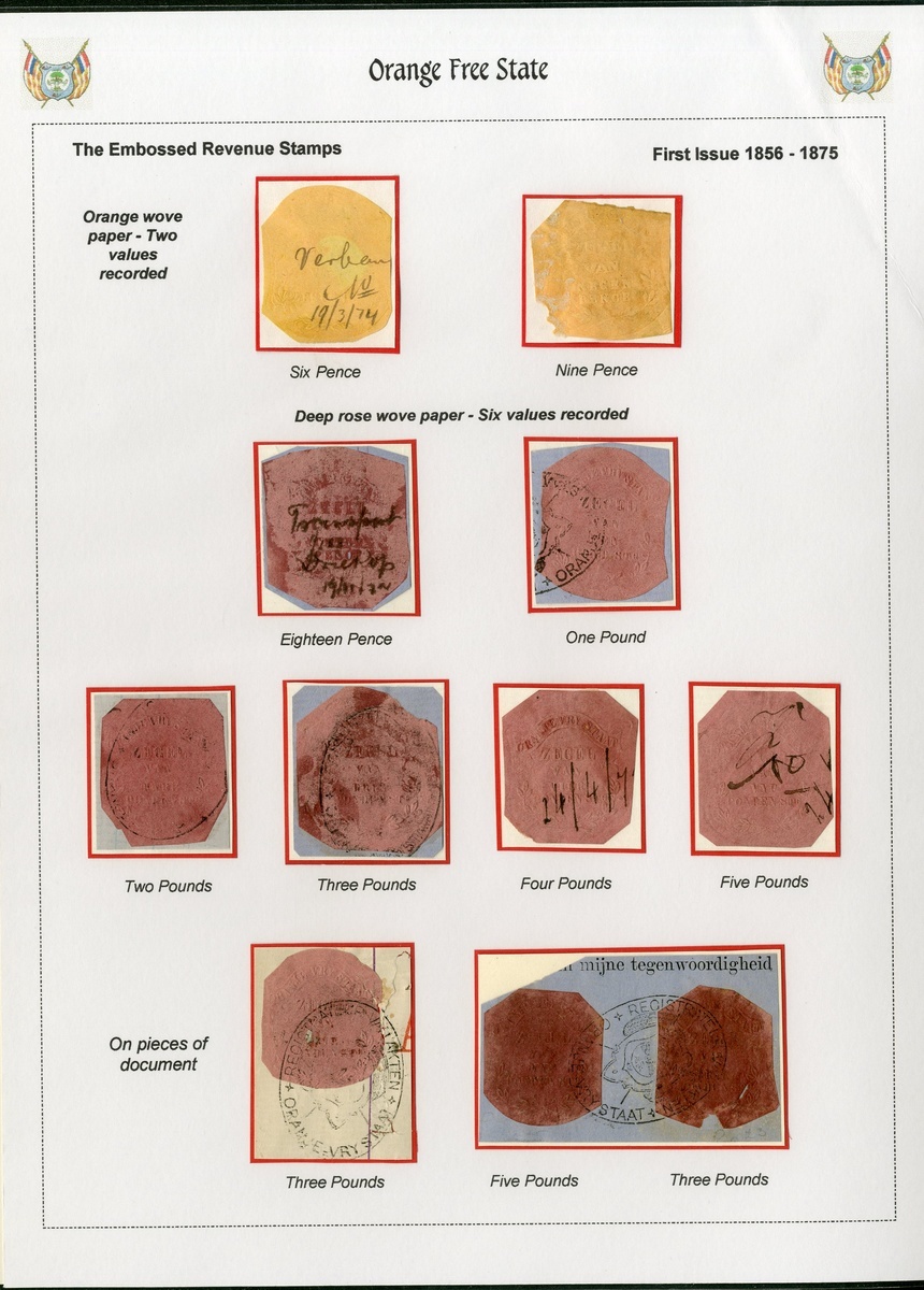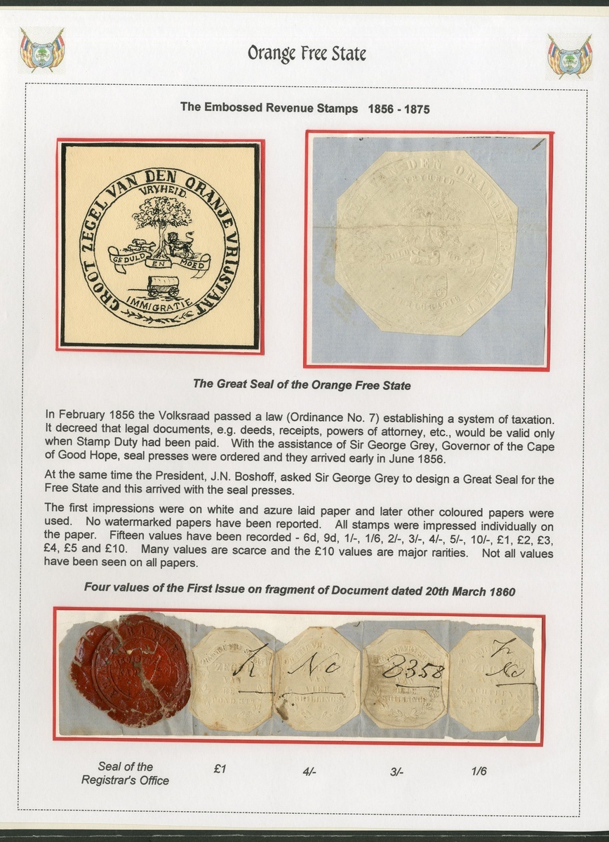 Collection beautifully written-up on exhibition pages in ring-bound album including first issue (white paper) combination franking of £1, 4/-, 3/- and 1/6d. all on same piece with wax seal, a page showing a detailed study of the papers used for the issues (nine varieties shown including wove/laid papers), a page of postal cancellations (7) on five different papers with values from 1/6d. to £3, (unlisted by S.G.), Dark green issues on wove paper, (10) including all values 9d. to £10, with additional 1/- on document page, Blue wove paper issues (7) with values to 10/- including 1/- on receipt, Orange wove paper 6d., 9d. (scarce), Deep rose wove paper issues (9), with values to £5, ties to piece with £3 (rare thus), and a charming authorisation document bearing 18d. Salmon-pink (wove); 1875 Second issue (Die II) complete set to £1, then a superb selection of documents (13) covering both issues showing combination usage, and a wide variety of applications including Coming of Age certificate, Auction list, Wedding license etc. A superb and unusually complete collection of these elusive issues rarely offered on document.