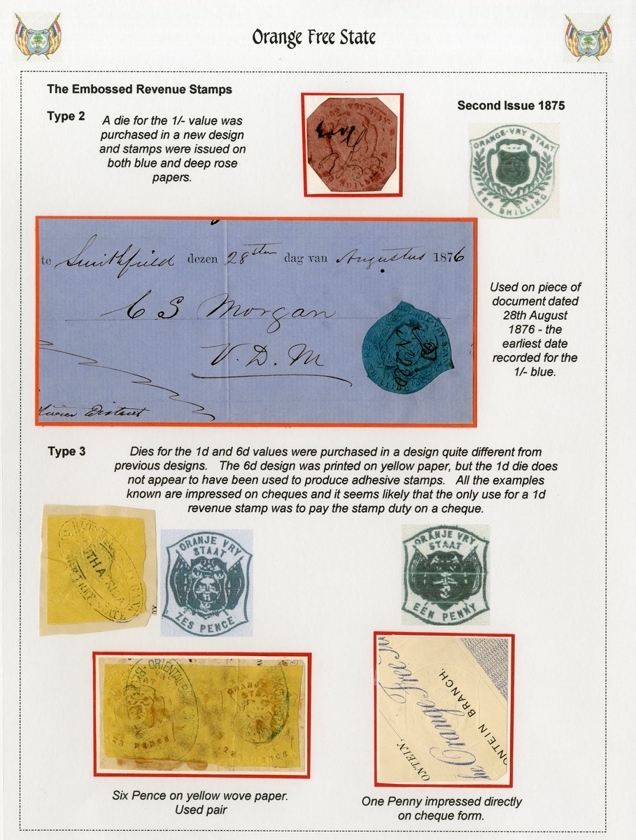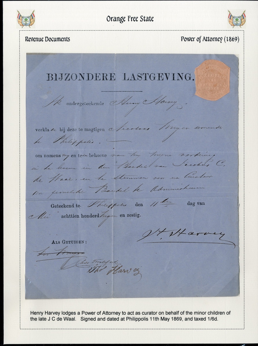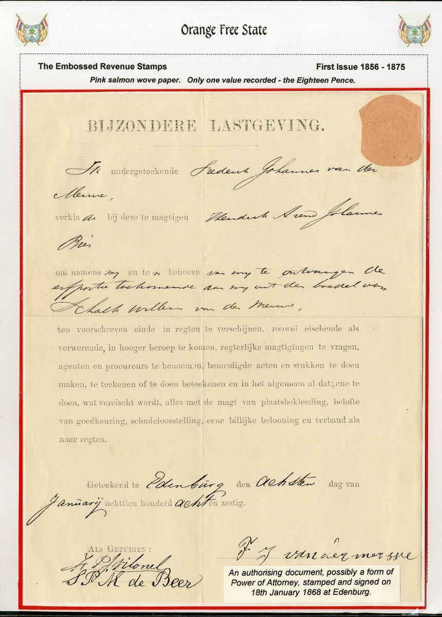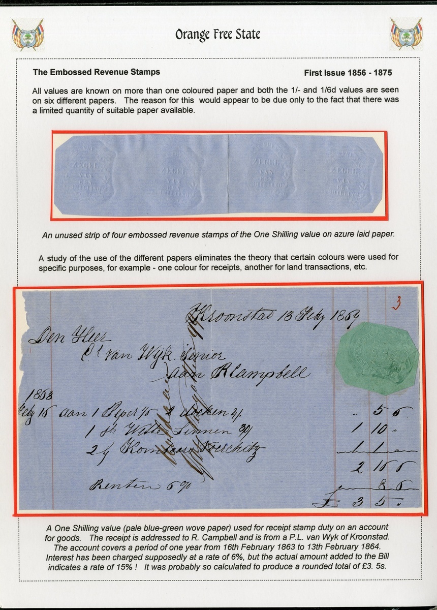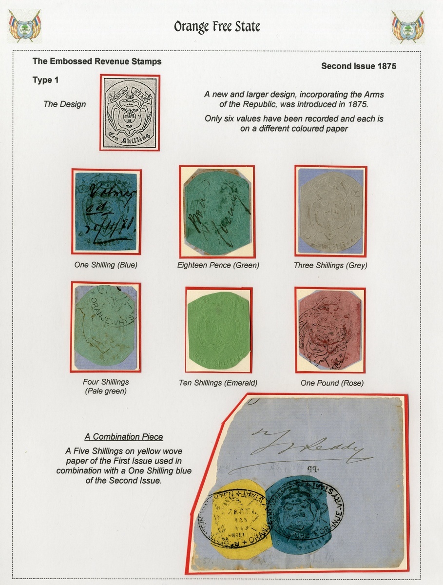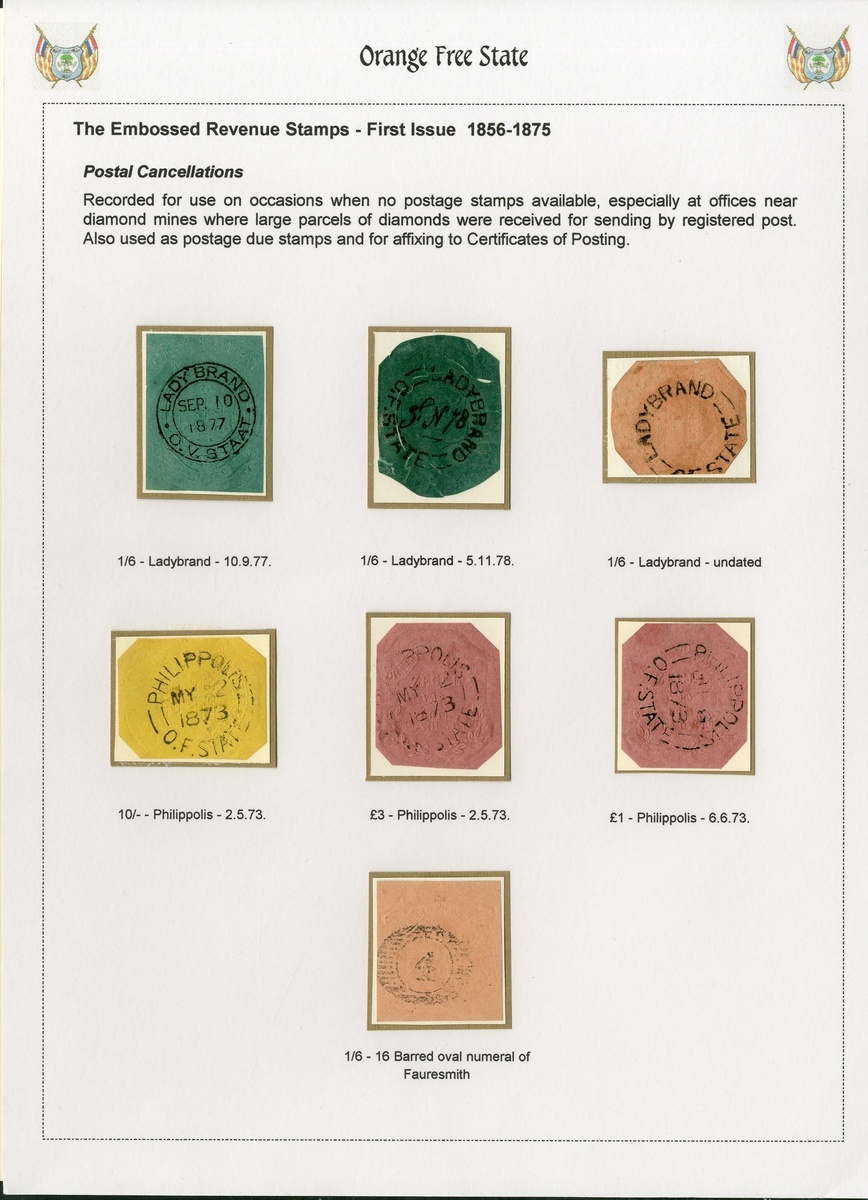 Collection beautifully written-up on exhibition pages in ring-bound album including first issue (white paper) combination franking of £1, 4/-, 3/- and 1/6d. all on same piece with wax seal, a page showing a detailed study of the papers used for the issues (nine varieties shown including wove/laid papers), a page of postal cancellations (7) on five different papers with values from 1/6d. to £3, (unlisted by S.G.), Dark green issues on wove paper, (10) including all values 9d. to £10, with additional 1/- on document page, Blue wove paper issues (7) with values to 10/- including 1/- on receipt, Orange wove paper 6d., 9d. (scarce), Deep rose wove paper issues (9), with values to £5, ties to piece with £3 (rare thus), and a charming authorisation document bearing 18d. Salmon-pink (wove); 1875 Second issue (Die II) complete set to £1, then a superb selection of documents (13) covering both issues showing combination usage, and a wide variety of applications including Coming of Age certificate, Auction list, Wedding license etc. A superb and unusually complete collection of these elusive issues rarely offered on document.