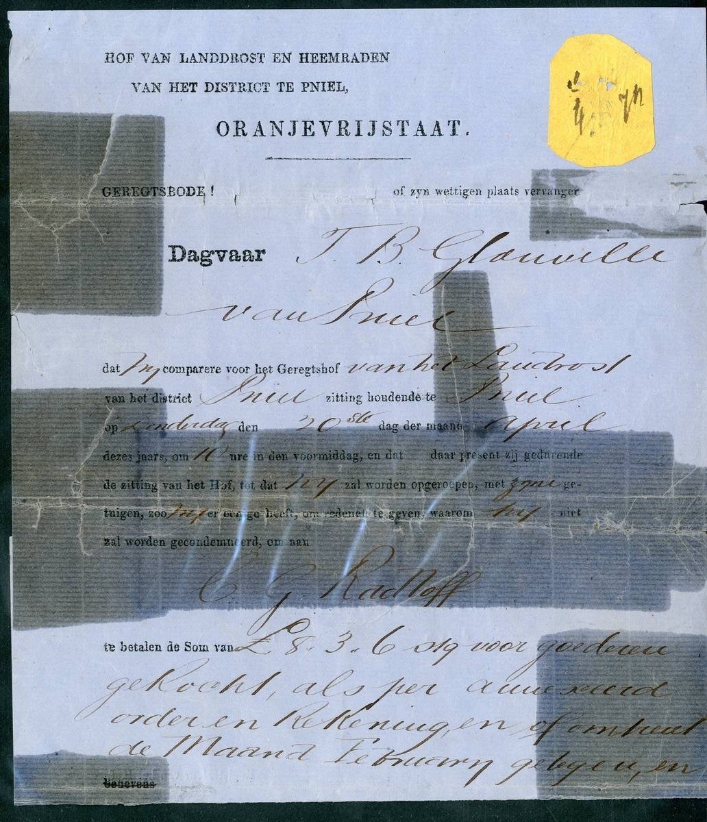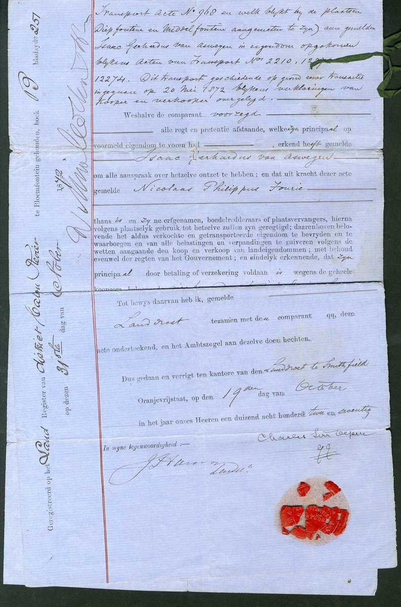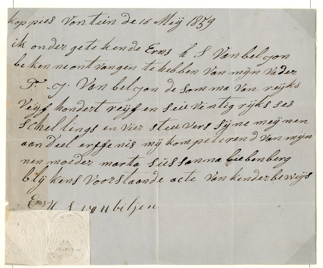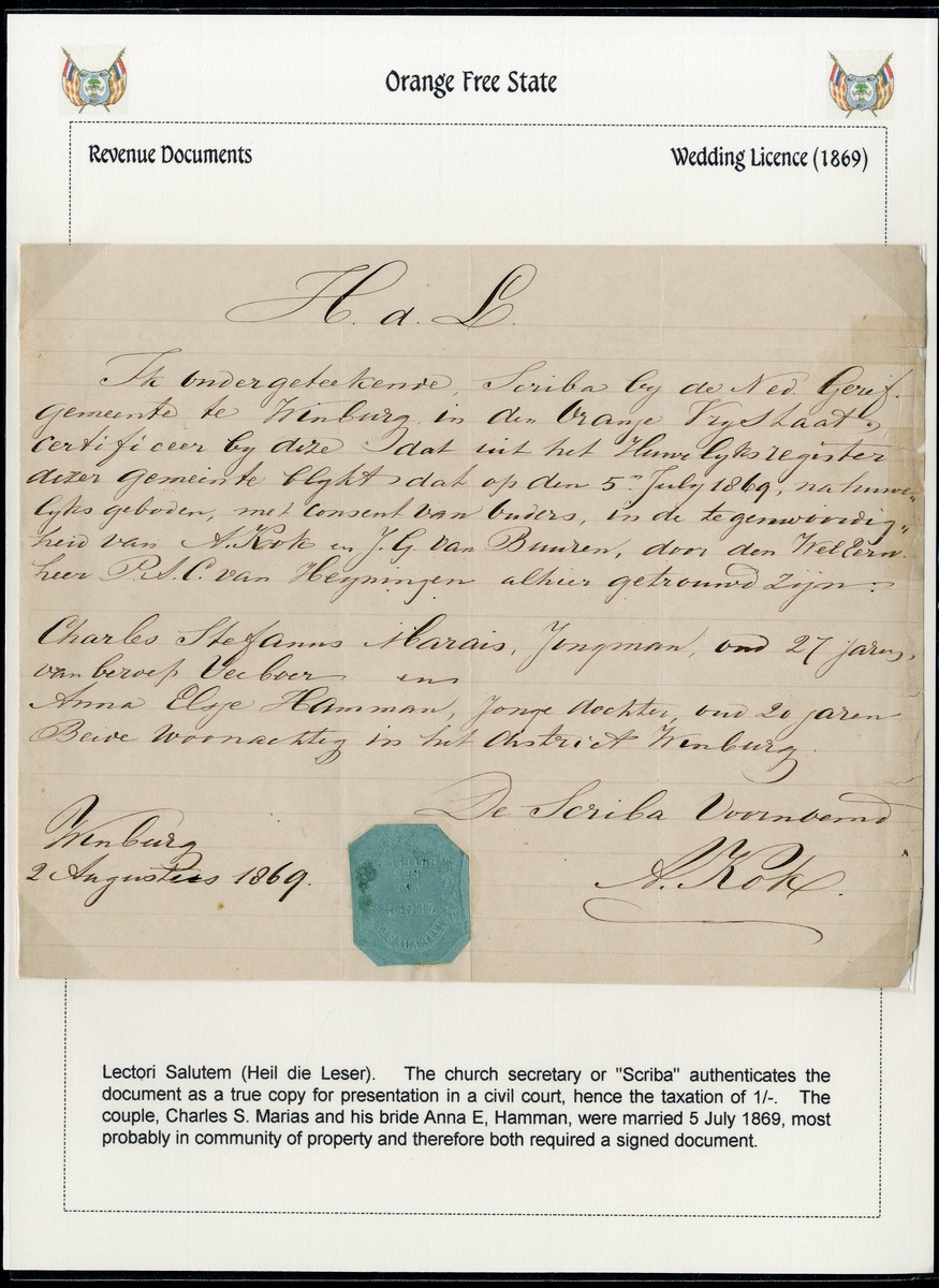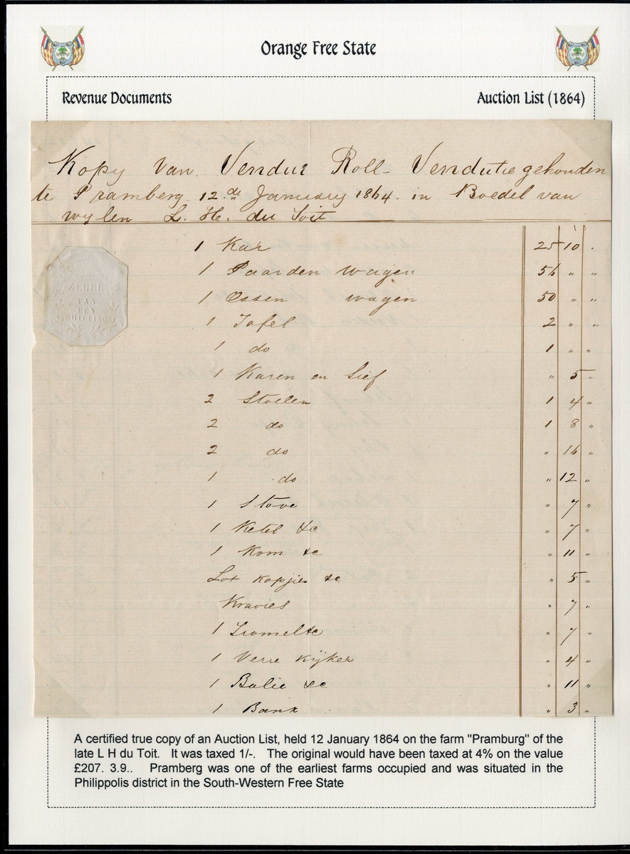 Collection beautifully written-up on exhibition pages in ring-bound album including first issue (white paper) combination franking of £1, 4/-, 3/- and 1/6d. all on same piece with wax seal, a page showing a detailed study of the papers used for the issues (nine varieties shown including wove/laid papers), a page of postal cancellations (7) on five different papers with values from 1/6d. to £3, (unlisted by S.G.), Dark green issues on wove paper, (10) including all values 9d. to £10, with additional 1/- on document page, Blue wove paper issues (7) with values to 10/- including 1/- on receipt, Orange wove paper 6d., 9d. (scarce), Deep rose wove paper issues (9), with values to £5, ties to piece with £3 (rare thus), and a charming authorisation document bearing 18d. Salmon-pink (wove); 1875 Second issue (Die II) complete set to £1, then a superb selection of documents (13) covering both issues showing combination usage, and a wide variety of applications including Coming of Age certificate, Auction list, Wedding license etc. A superb and unusually complete collection of these elusive issues rarely offered on document.