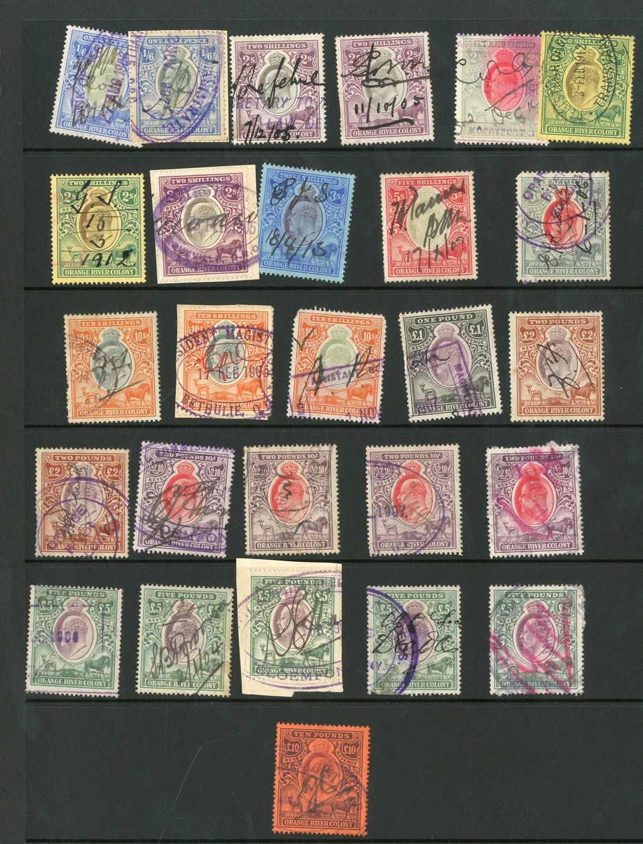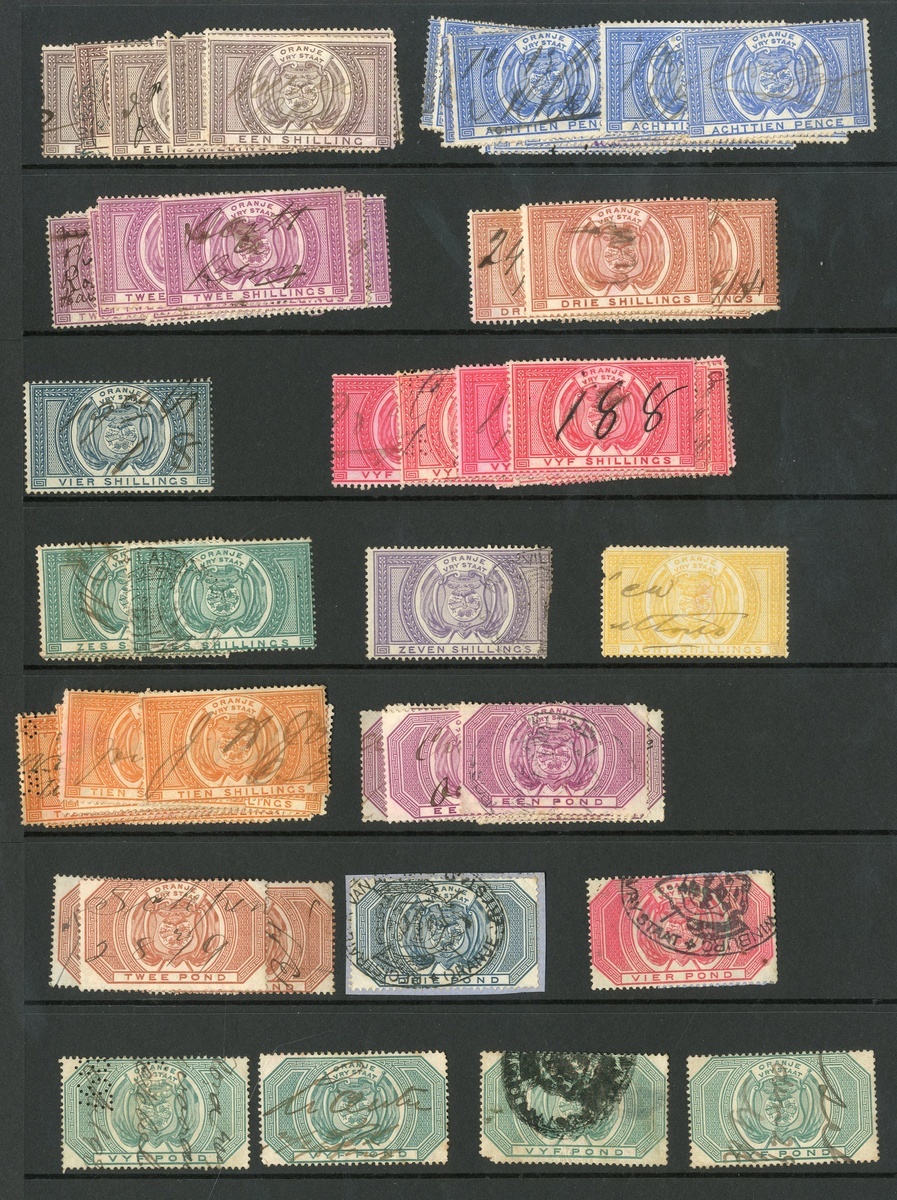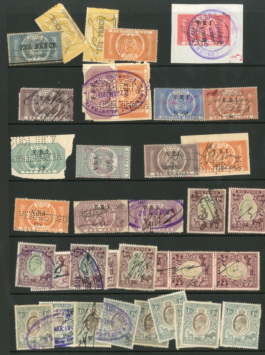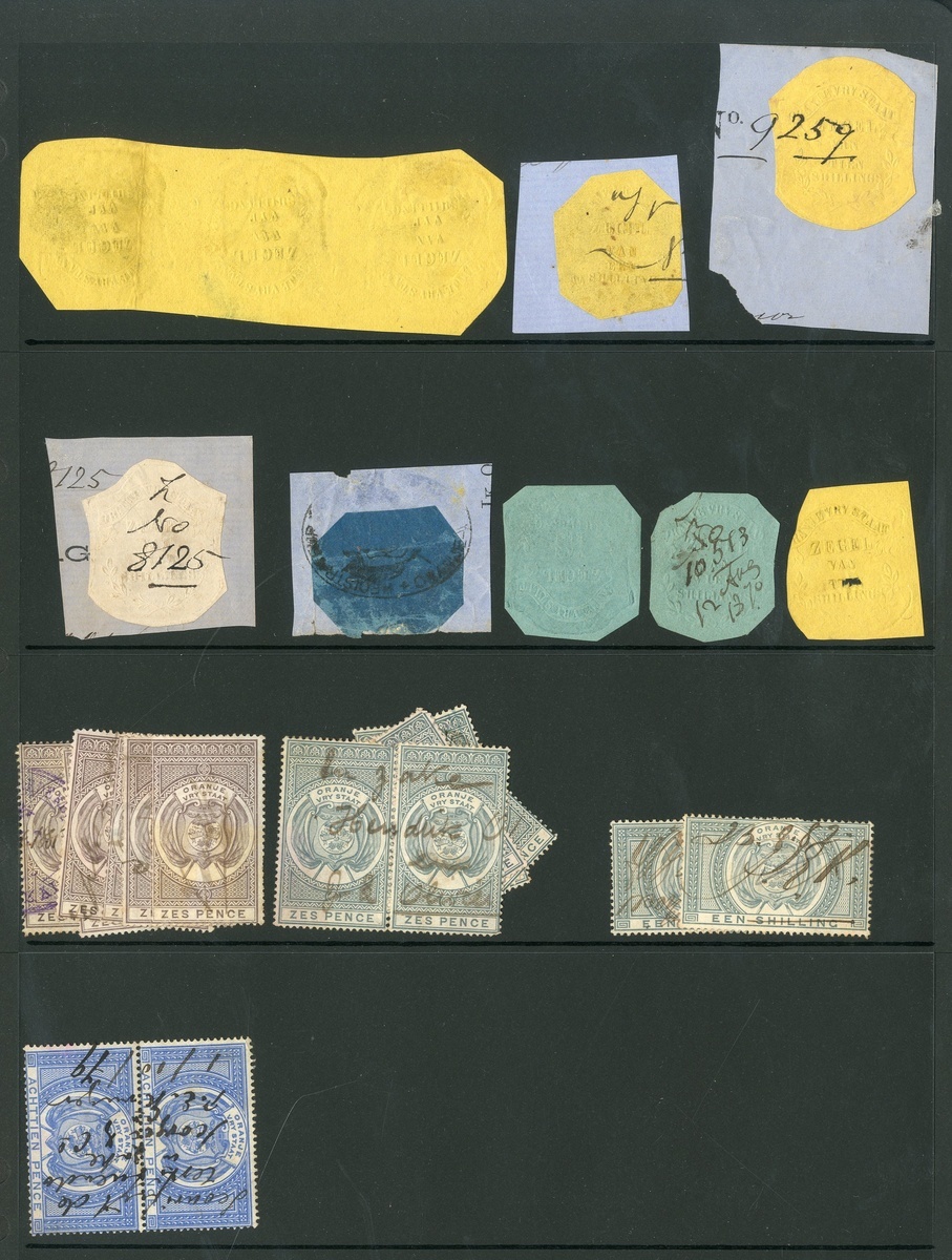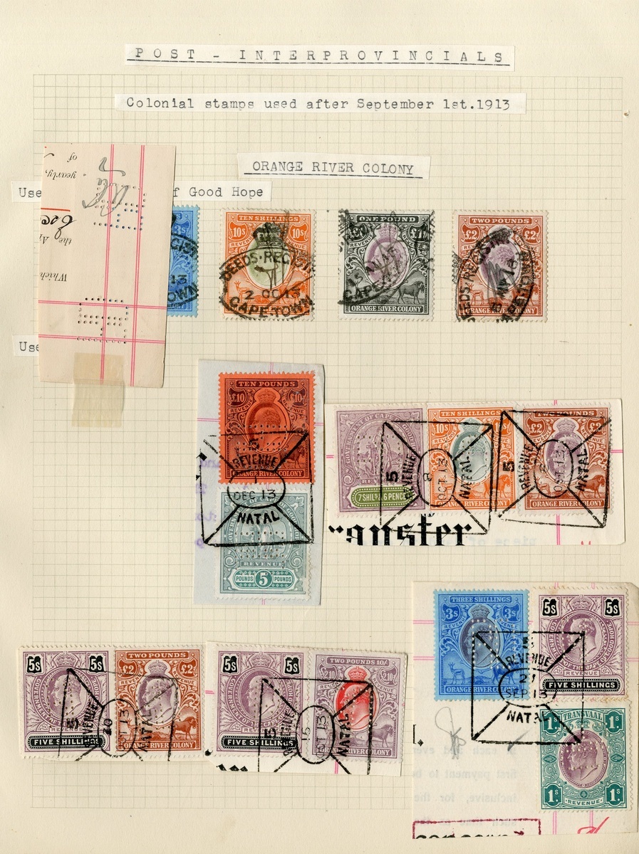 1856-1905 collection on pages (200+) with documents (11), including 1856 embossed types (30) assorted values including one on document, 1878-82 complete set with multiples of most values, with £5 (2) used on a Salesman's license, provisionals and V.R.I. overprints to £5, (23), then 1903 "Orange River Colony" KEVII set complete to £10 (4), and 5/- and 10/- each used on complete firearms licenses, also a including a stunning collection of interprovincial usages on piece, including 1903 £10 and C.O.G.H. 1898 £5 combination franking used in Natal (!), and a group of loose and duplicates in envelopes. An interesting lot.