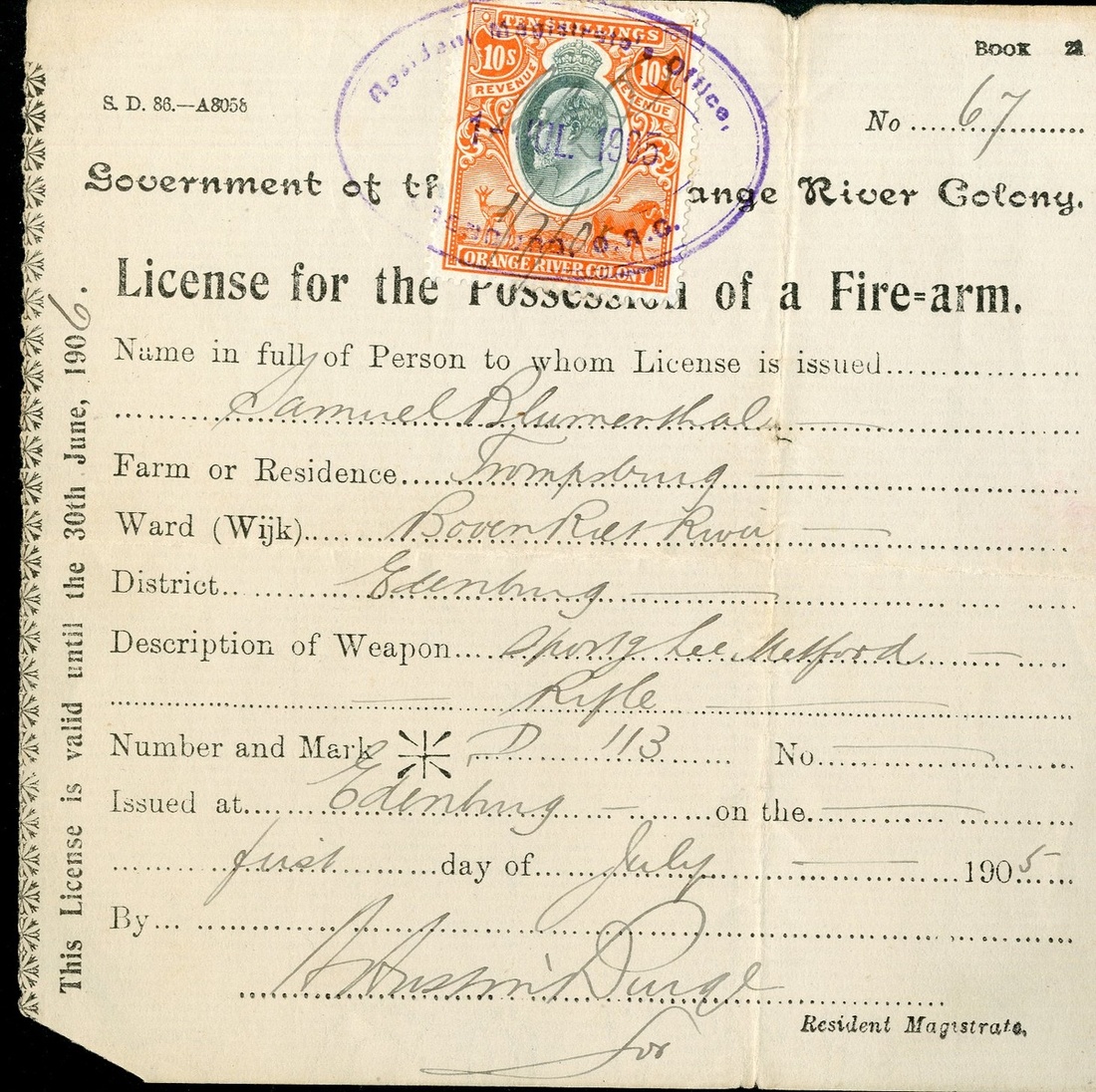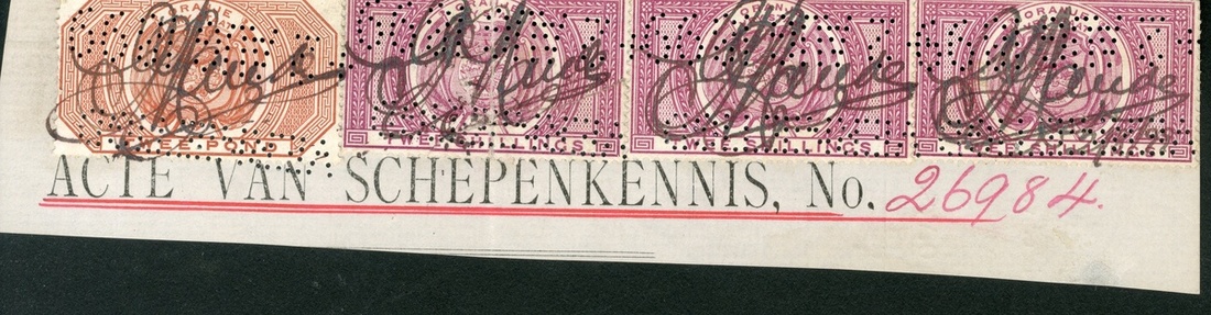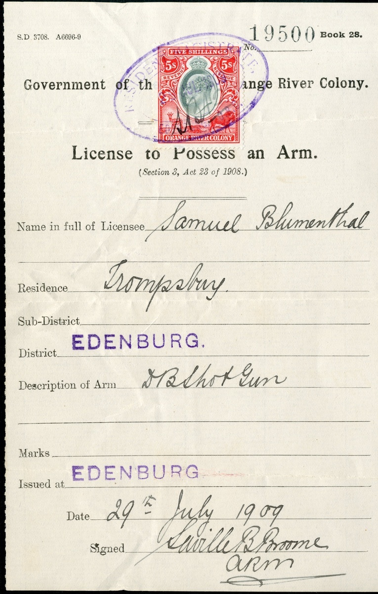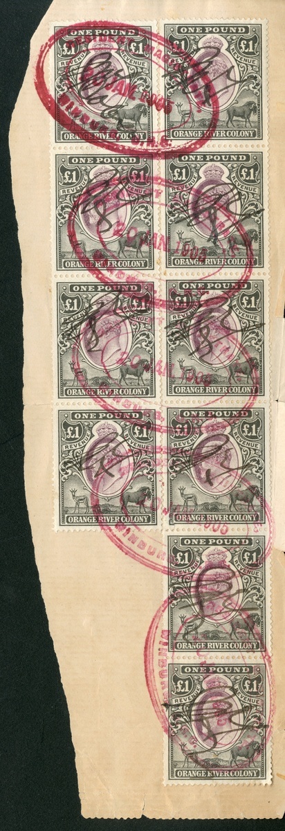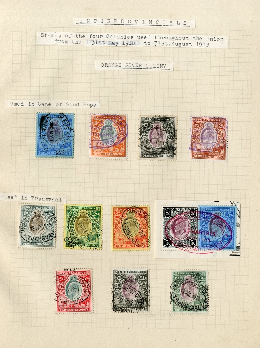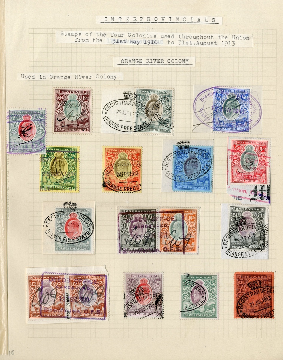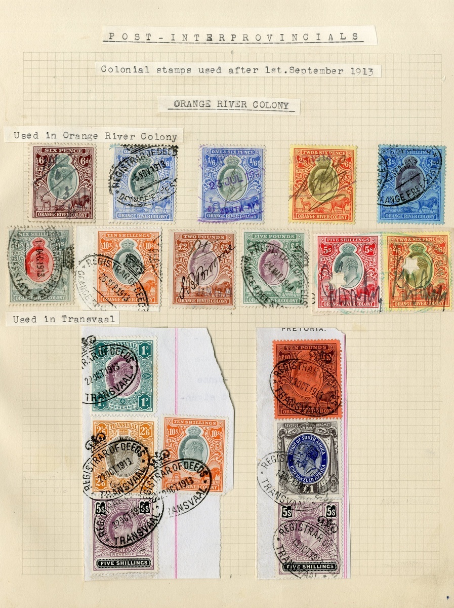 1856-1905 collection on pages (200+) with documents (11), including 1856 embossed types (30) assorted values including one on document, 1878-82 complete set with multiples of most values, with £5 (2) used on a Salesman's license, provisionals and V.R.I. overprints to £5, (23), then 1903 "Orange River Colony" KEVII set complete to £10 (4), and 5/- and 10/- each used on complete firearms licenses, also a including a stunning collection of interprovincial usages on piece, including 1903 £10 and C.O.G.H. 1898 £5 combination franking used in Natal (!), and a group of loose and duplicates in envelopes. An interesting lot.