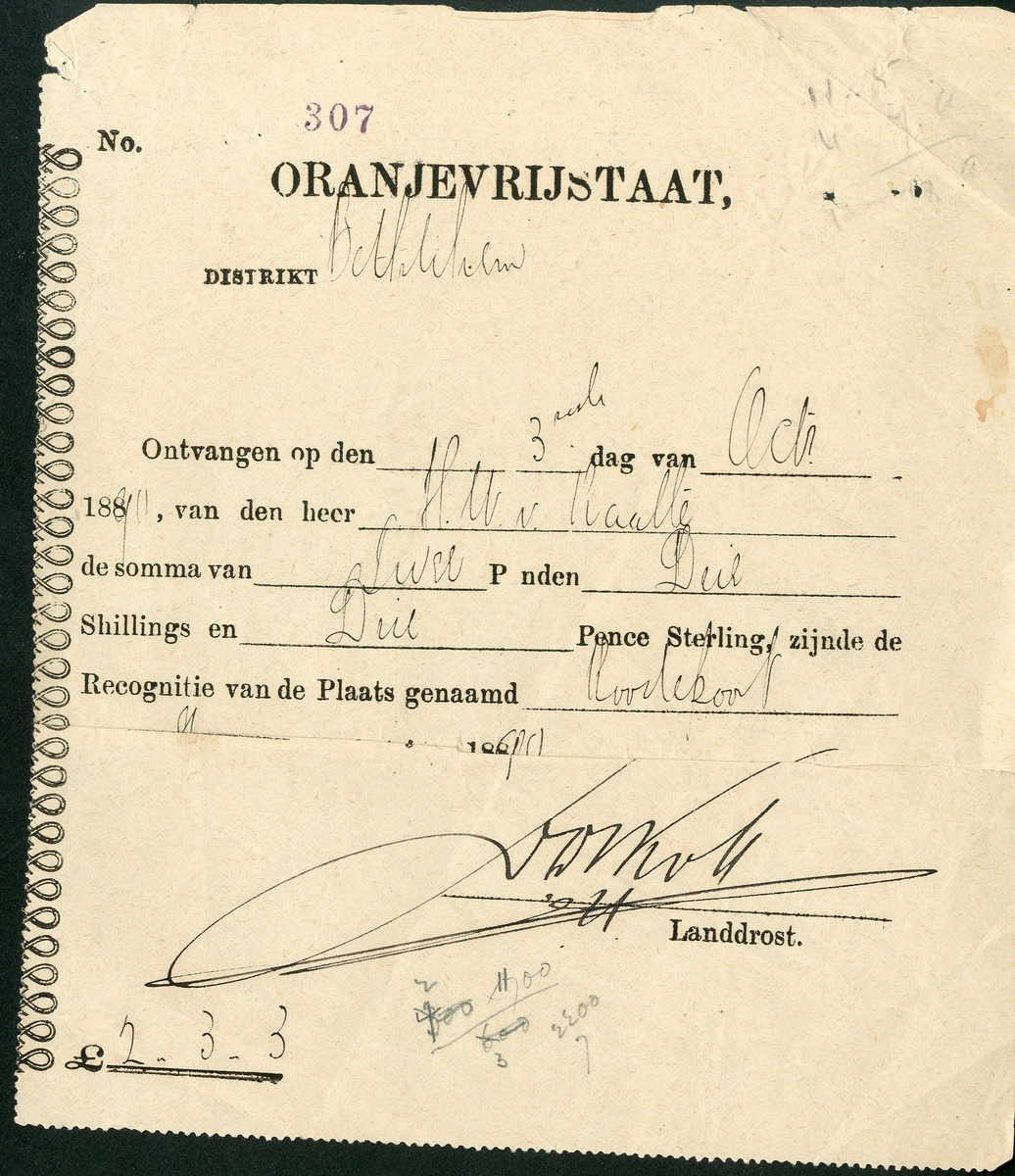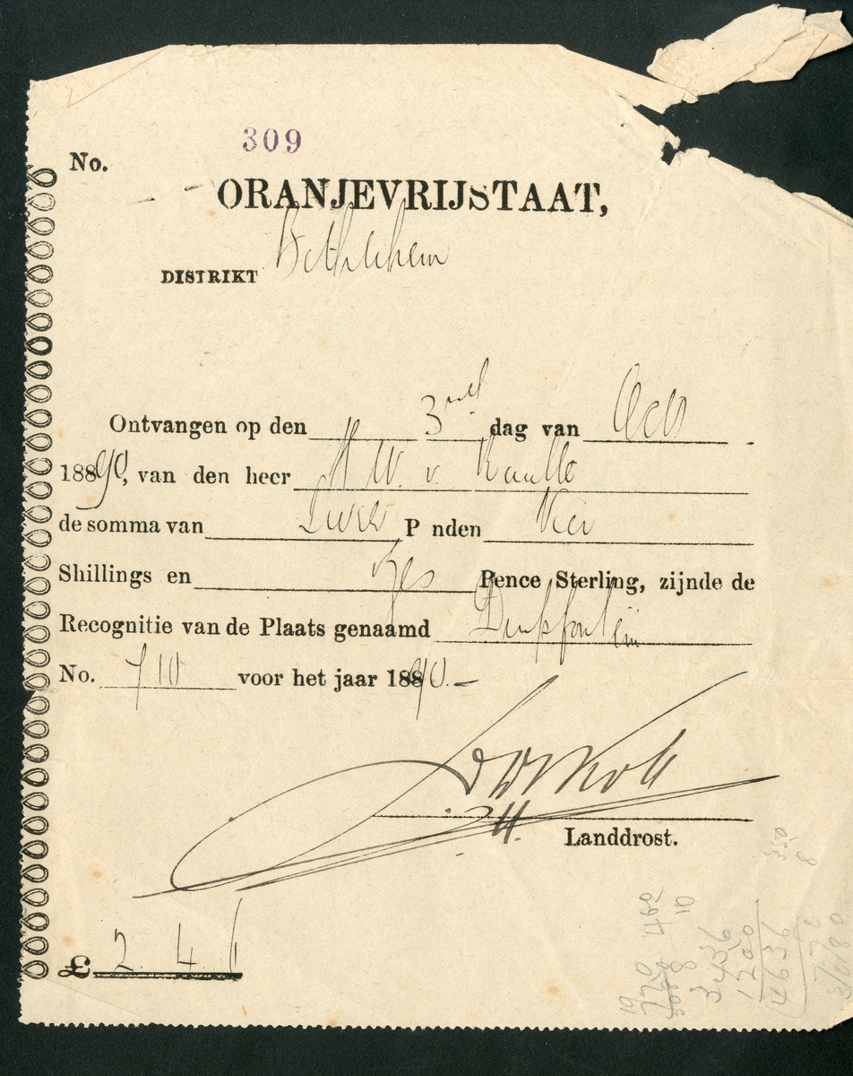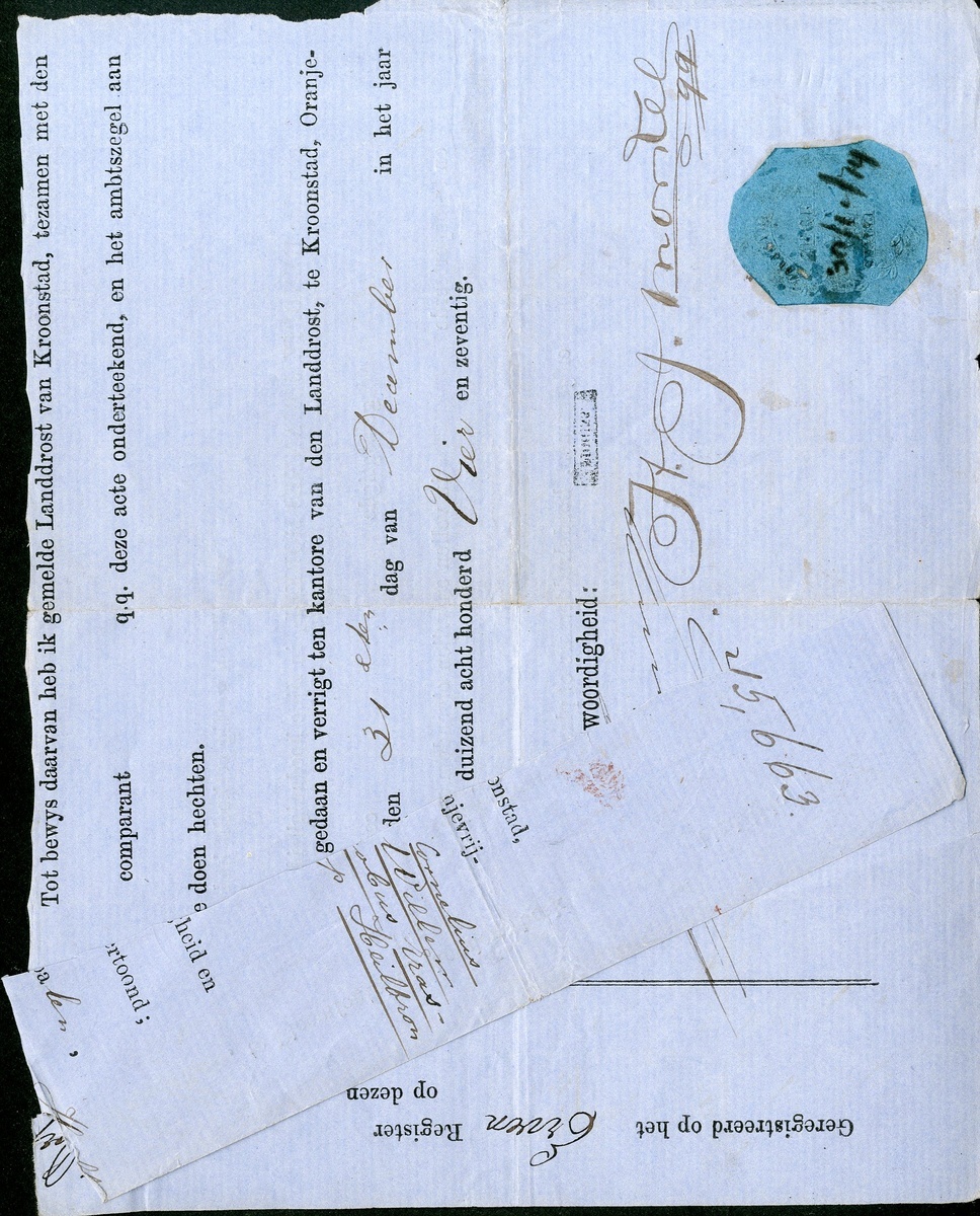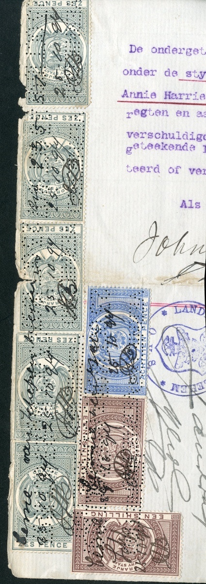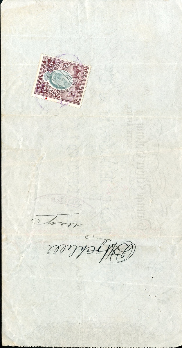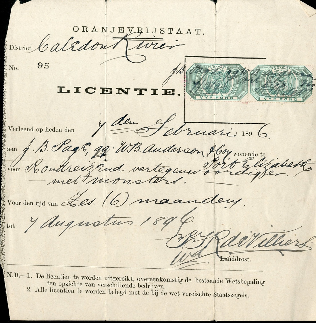 1856-1905 collection on pages (200+) with documents (11), including 1856 embossed types (30) assorted values including one on document, 1878-82 complete set with multiples of most values, with £5 (2) used on a Salesman's license, provisionals and V.R.I. overprints to £5, (23), then 1903 "Orange River Colony" KEVII set complete to £10 (4), and 5/- and 10/- each used on complete firearms licenses, also a including a stunning collection of interprovincial usages on piece, including 1903 £10 and C.O.G.H. 1898 £5 combination franking used in Natal (!), and a group of loose and duplicates in envelopes. An interesting lot.