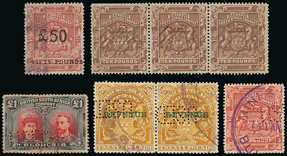 1890-1919 collection of Postage and Revenue stamps (107) including 1890 values to £10 (5 with a strip of three), 1896 £50 on £2, 1896-97 perf. 12½ £50 and £100 and perf. 15 £30 purple and green (3), £50 (2) and £100 (2), 1898-1908 values to £20, 1907 overprinted "revenue" values to £20 (7 with two pairs) with £2 and £10 apparently unused, and a selection of Double Heads (17) to £1 (3). An interesting group1898-1908 range of the Waterlow file stamps arranged by printings from order number 110571 of 1 April 1897 to order number 149786 of 23 October 1906 and comprising ½d, (5), 1d. (7), 2d., 2½d. (6), 3d., 4d., 6d. (2), 1/- (4), 2/6d., 3/- (2), 5/- and 10/- block of four, 7/6d., £1 (2), £2, £5, £10, £20 and £100 singles, each stamp with one small or large punch hole; all neatly mounted and attractively written-up on six Robson Lowe pages