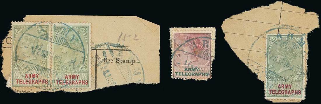 1899-90 group of unusual cancellations comprising 10/- green and red (2), 5/- green and mauve and 6d. lilac and green, each on piece, cancelled with V-R (Volksrust) cancellation in blue, the 10/- pair particularly desirable with a complete strike on large piece, large part of a second strike unusually below the adhesives, offered with large form piece bearing 1d. lilac and black (12), and a second piece bearing 2/6d. green and brown (2), all cancelled individually with "16/8/00" and initials in manuscript. A most unusual group, the blue cancellations extremely rare. Photo