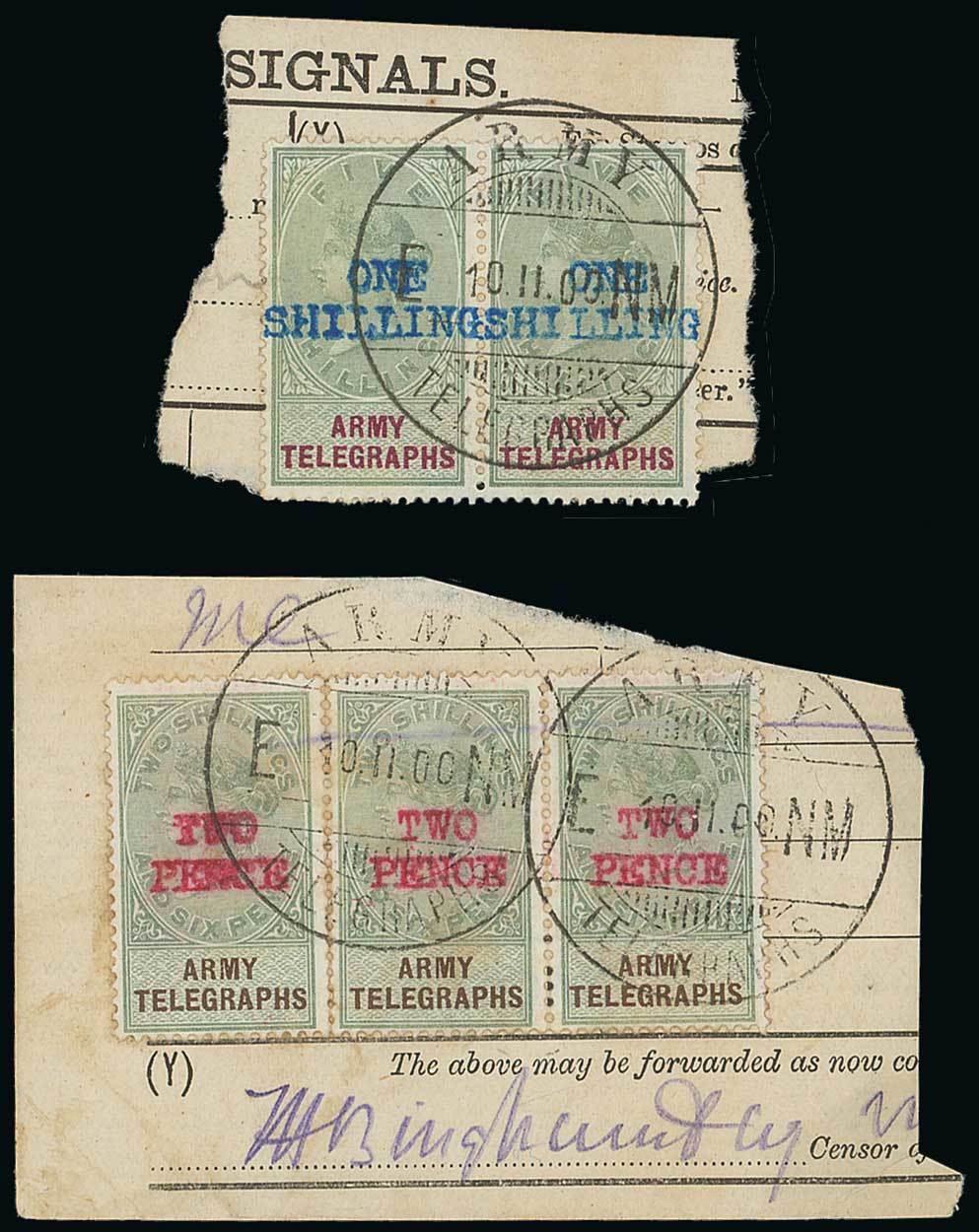 1900 provisional overprint 2d. on 2/6d. green and brown, (3 including horizontal pair), tied to piece by "E-NM" c.d.s. dated "10.II.00" and 1/- on 5/- green and mauve, horizontal pair, tied to piece by the same cancellation and same date. Most attractive pieces in condition much above average. Photo