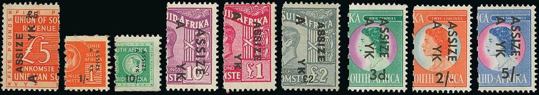 1930-54 remarkable collection on stocksheet (46), all "A" halves, used uncancelled, comprising 1930 opt. on South Africa Revenue 6d., 5/- (2), and £1 (unlisted), 1938-42 3d. (2), 6d., 2/- (4), 2/6d. and 5/- (2), 10/-, £1 (3), £2 and £5, 1942 opt. on Native tax 2/6d. (2), 1943 'Bantams' 1/- (3) and 10/- (3), 1946/52 6d., 1/- (2), 2/- (2), 2/6d., 10/- (2), £1 and £2, 1954 3d. to 5/- complete set of three and 1954-58 3d. to 10/- part set of five. A remarkable group of these rarely offered issues. Photo