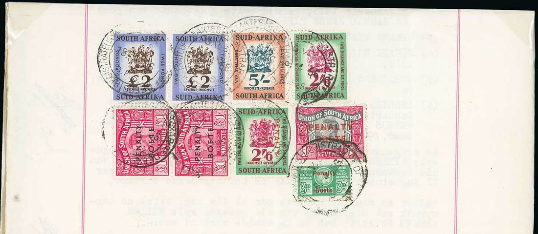 1910-31 collection of documents (39) the first group (25) bearing KGV issues, including 2/6d. brown & green with manuscript overprint, 1937 £5 used on document, second group KGVI documents (14) including 3d. Bantam overprint (scarce) used on combination franking, a few high values scattered throughout with many more interesting combination frankings with issues of other reigns, provincial period etc. An interesting lot. Photo