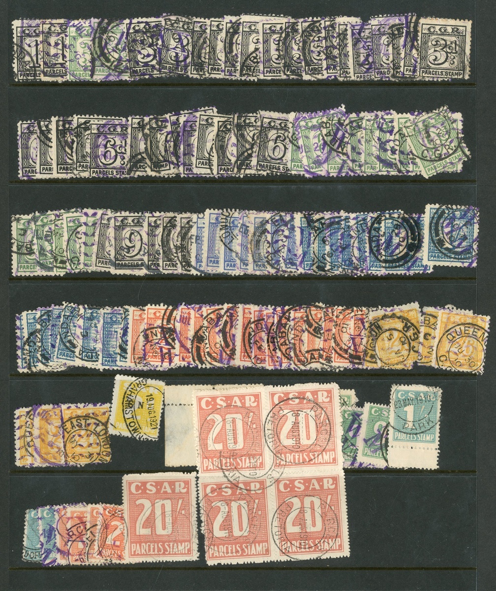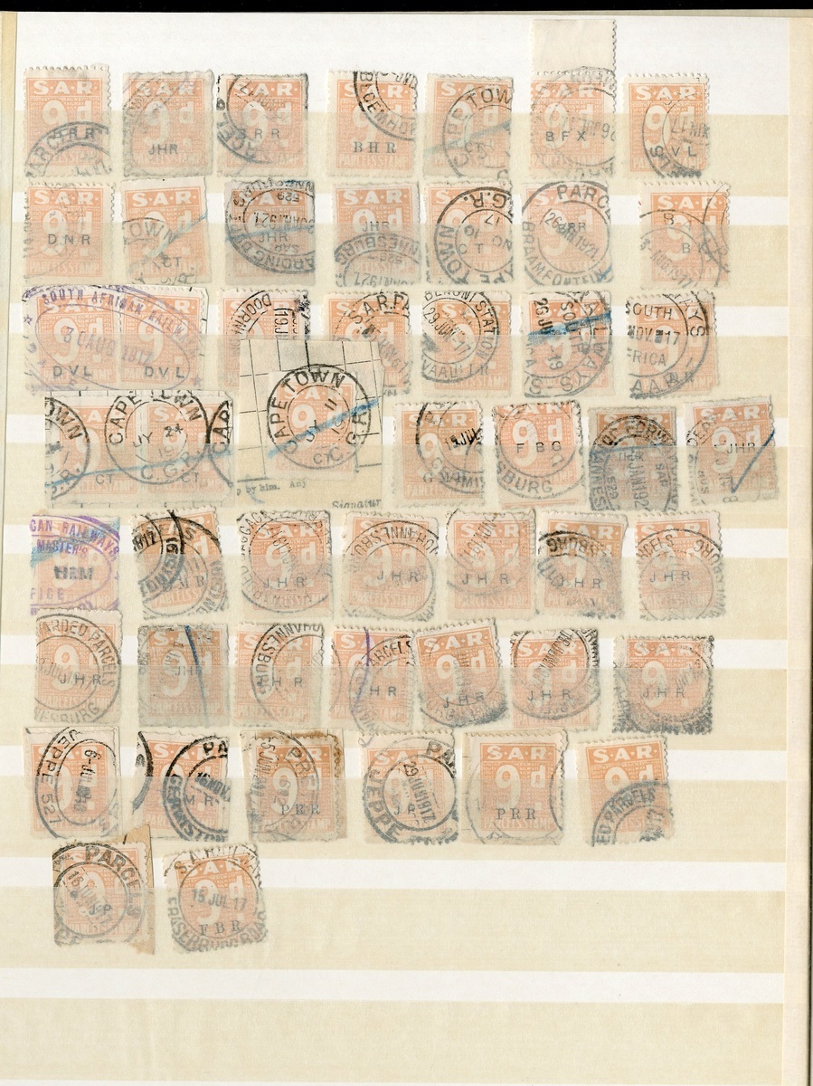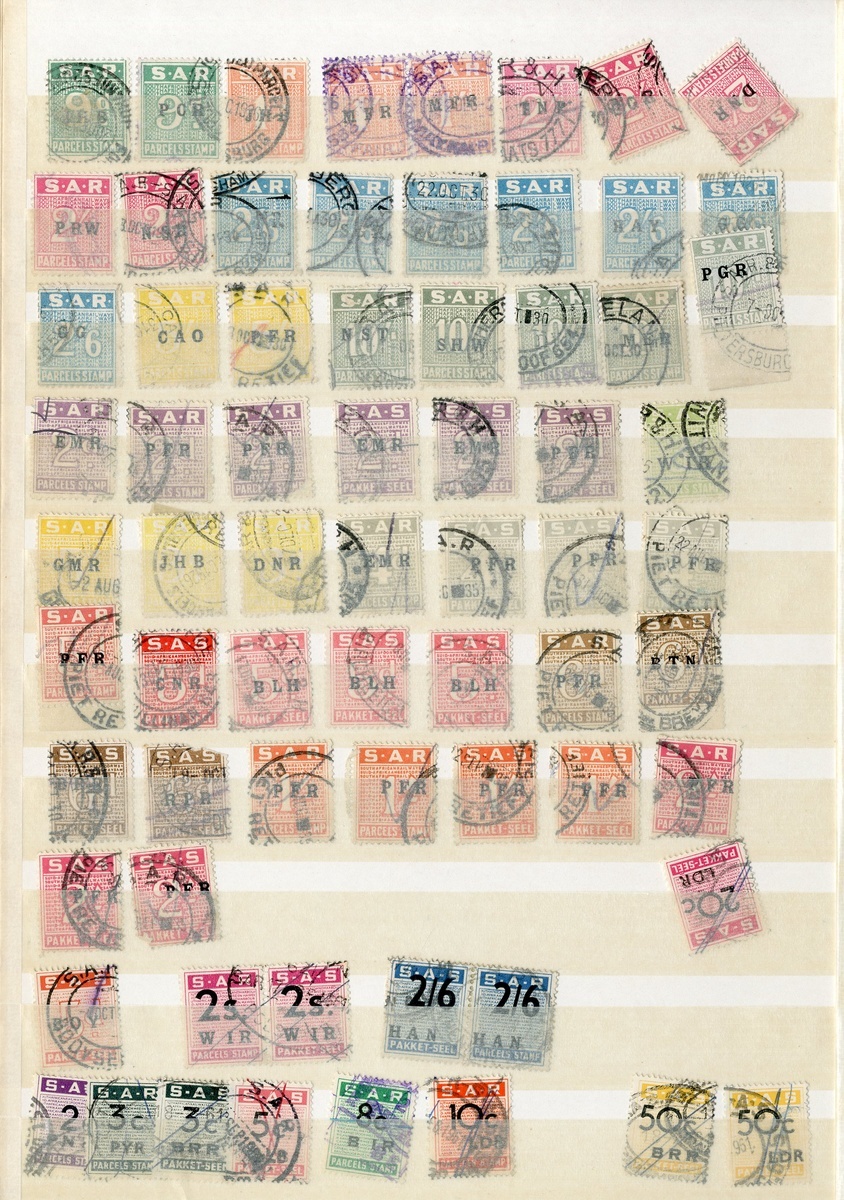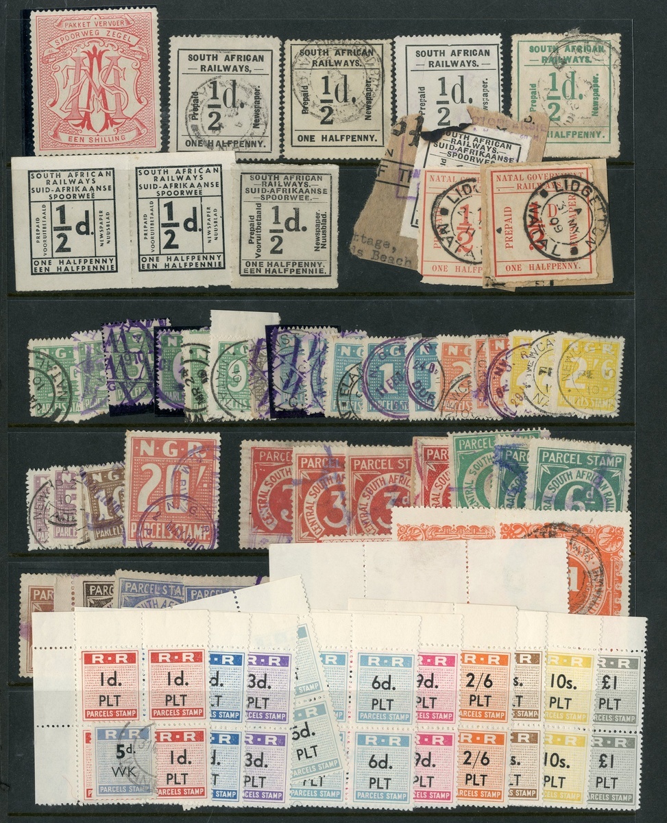 Collection (100's) of South African provinces and surrounding territories, including 1909 Natal Government Railways used to 20/-, Rhodesia Railways 1942-47 1d. orange, mint and used, Beira and masholand 1d. red used, Central South African Railways 1902 1d. to 1/- used, and 1909 1d. to 20/- set used, South African Railways 1909 set to 20/- including pair imperforate between Stamp and Margin, and large blocks used, various staion codes etc. Duplication in places although careful sorting sure to reward, a most interesting collection.
