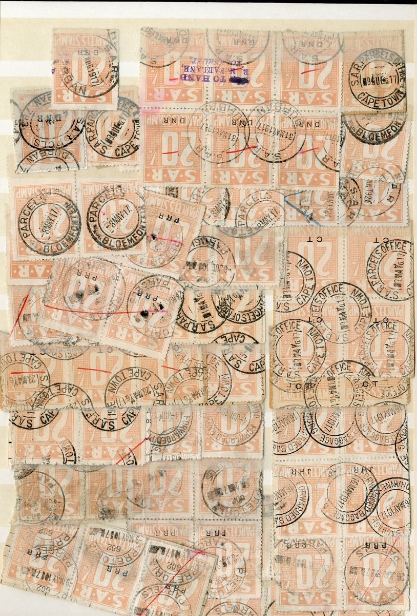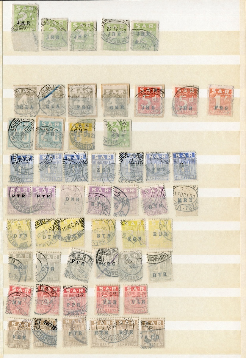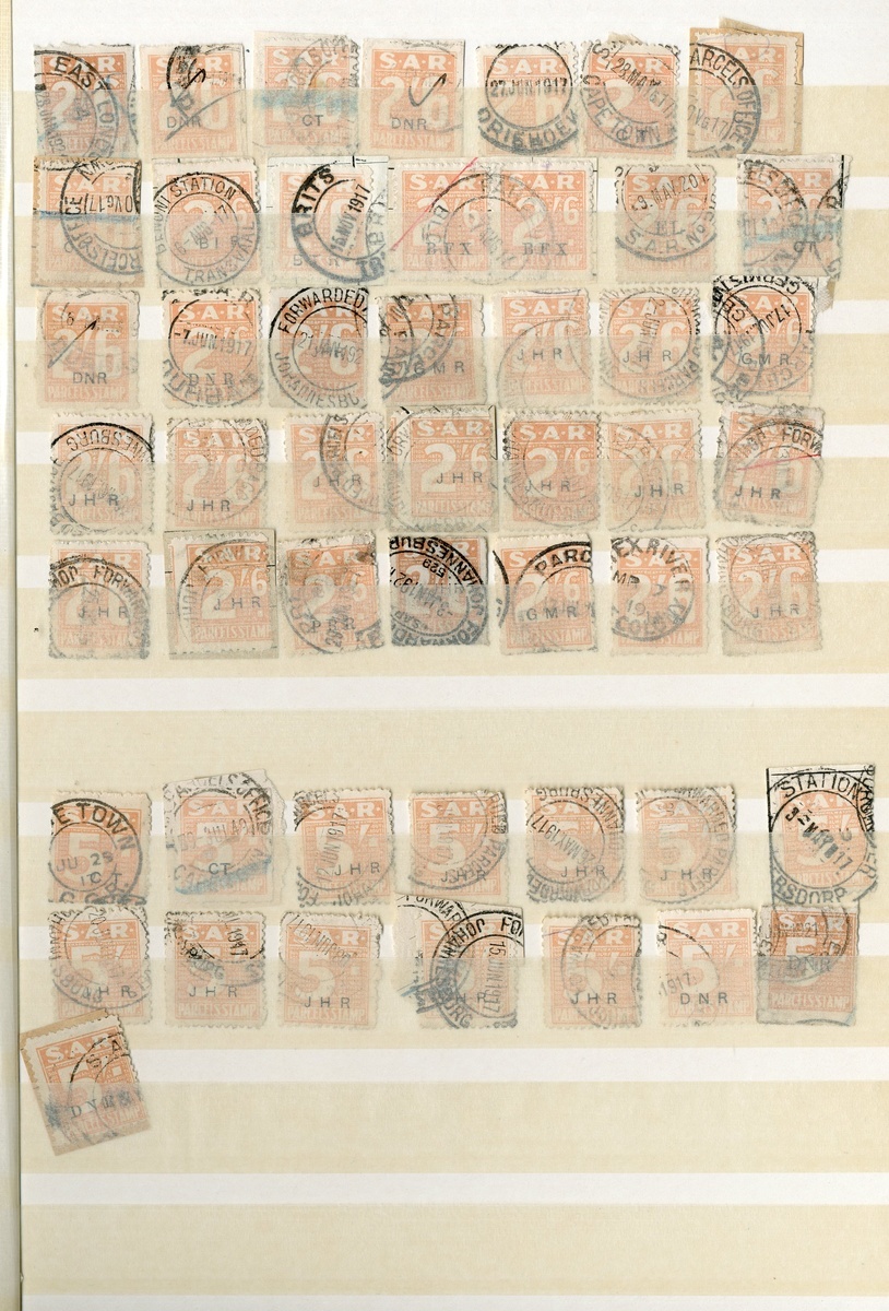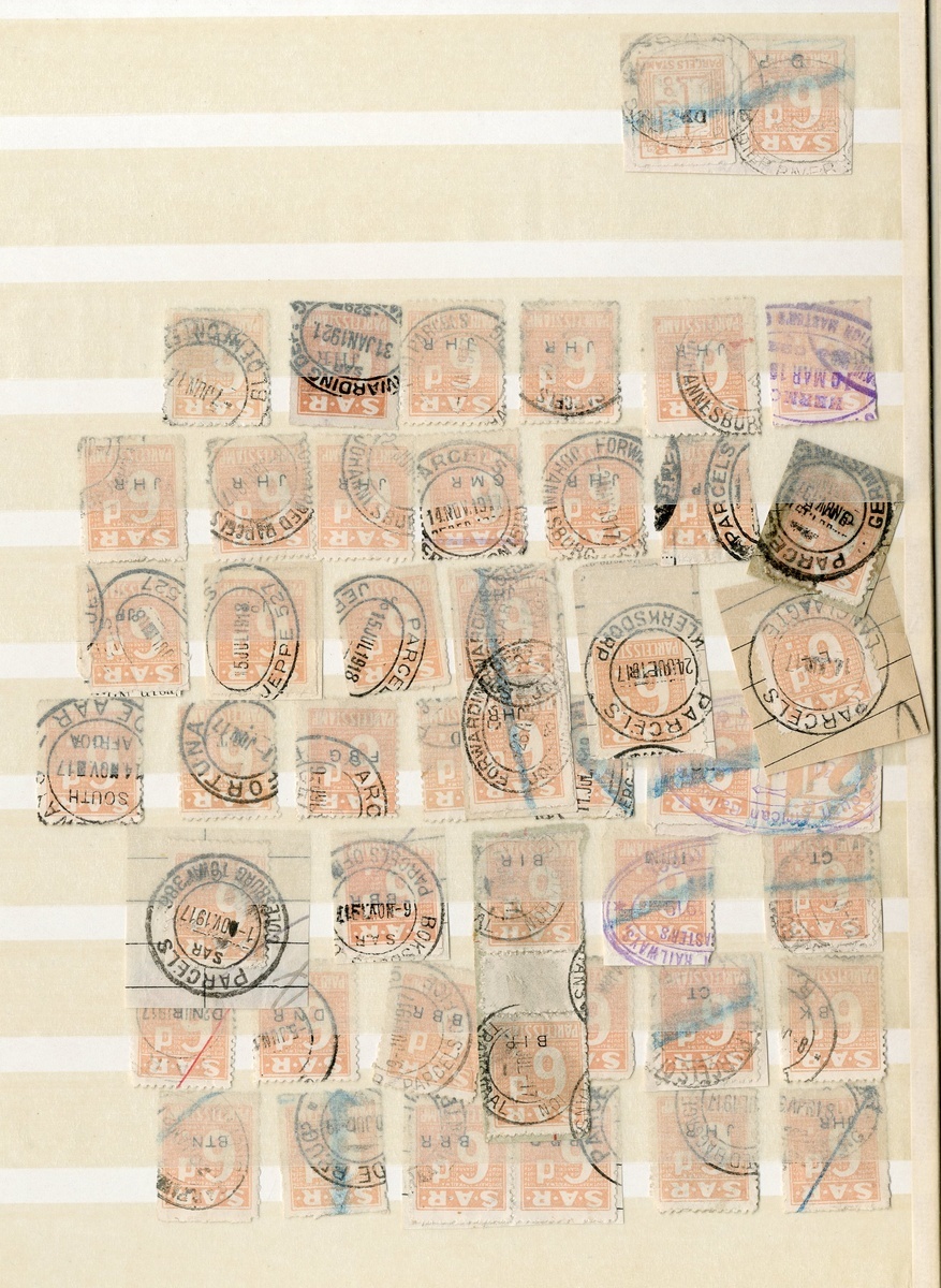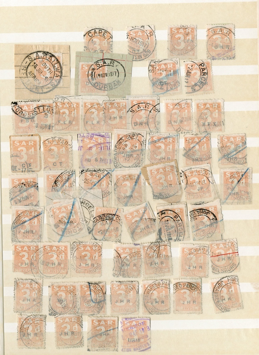 Collection (100's) of South African provinces and surrounding territories, including 1909 Natal Government Railways used to 20/-, Rhodesia Railways 1942-47 1d. orange, mint and used, Beira and masholand 1d. red used, Central South African Railways 1902 1d. to 1/- used, and 1909 1d. to 20/- set used, South African Railways 1909 set to 20/- including pair imperforate between Stamp and Margin, and large blocks used, various staion codes etc. Duplication in places although careful sorting sure to reward, a most interesting collection.