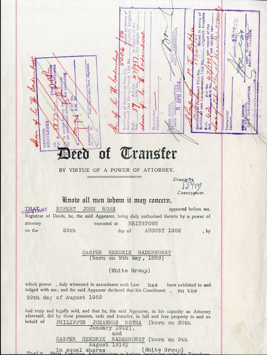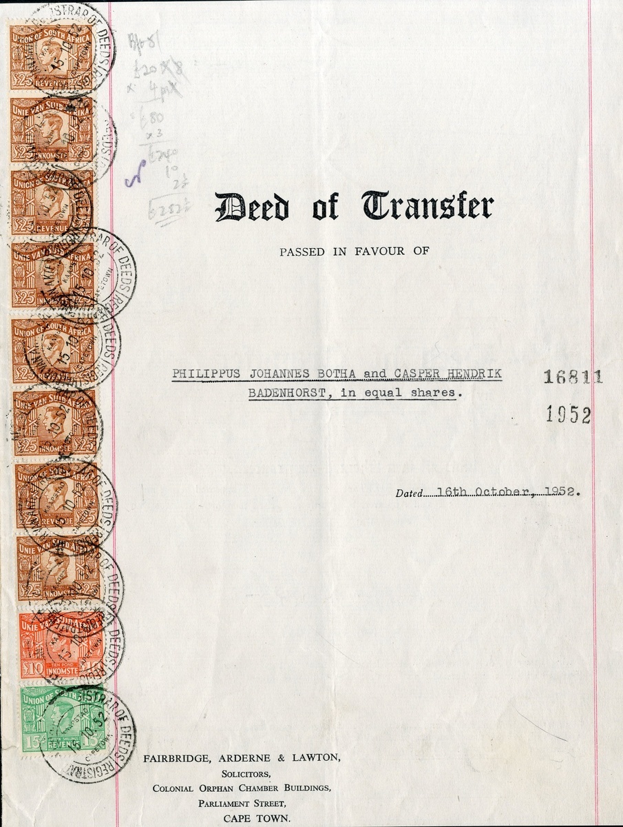 1952 (16 Oct.) Deed of Transfer front page bearing 1947 £25 brown (8), in two vertical bi-lingual strips of four, also 1948 £10 orange and 15/- green, each neatly cancelled with "registrar of deeds/ capetown" c.d.s. Spectacular multiple usage of this popular top value in lovely fine condition.