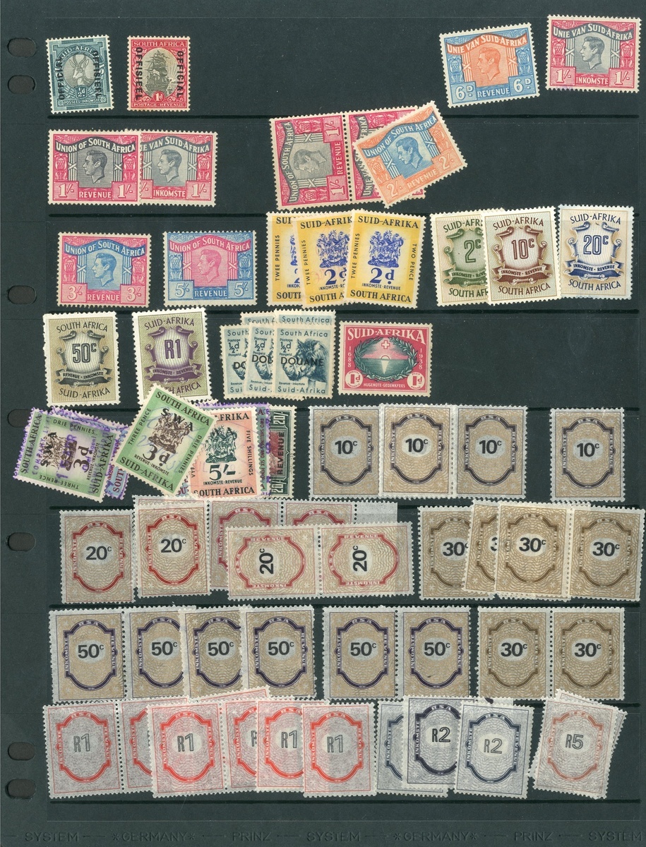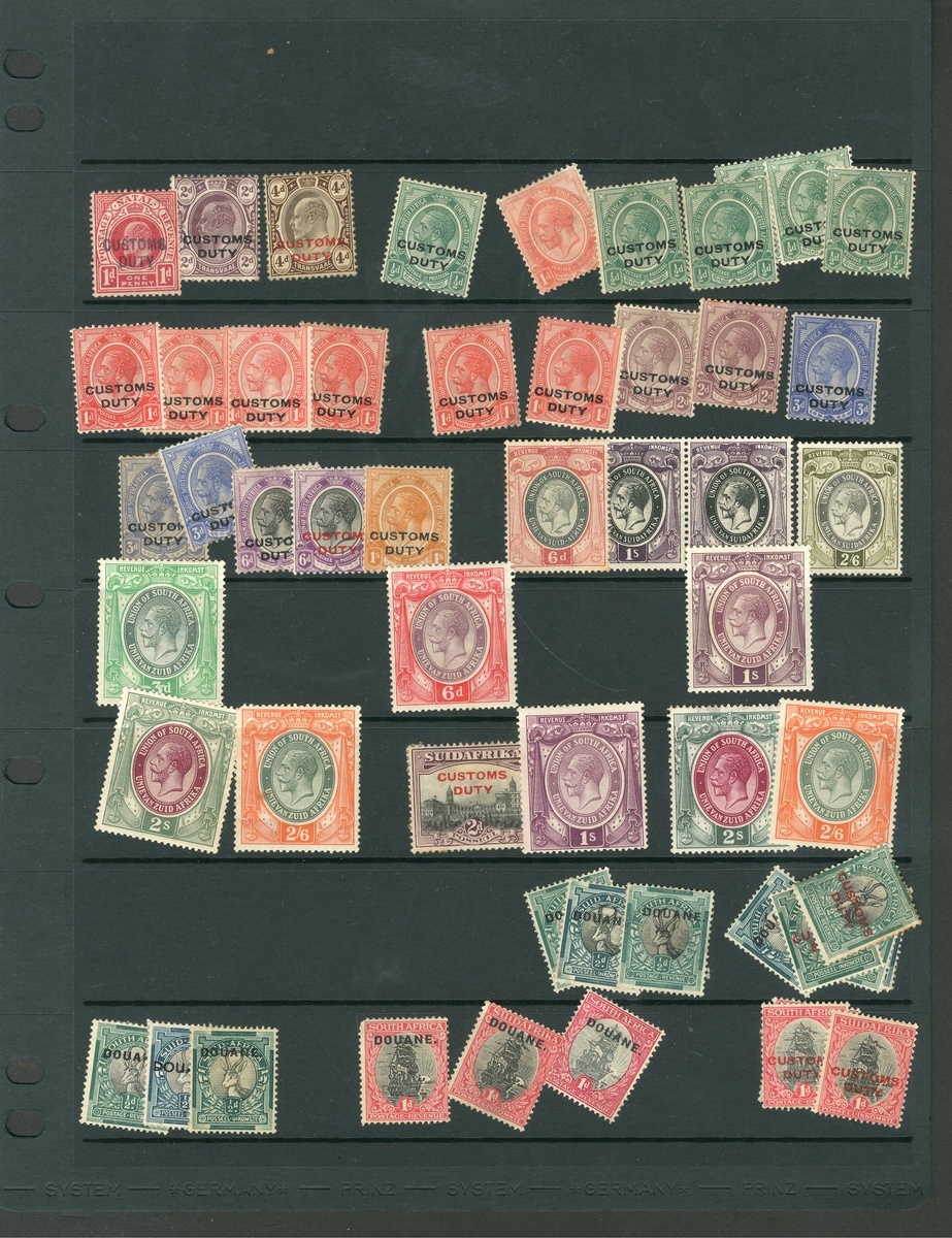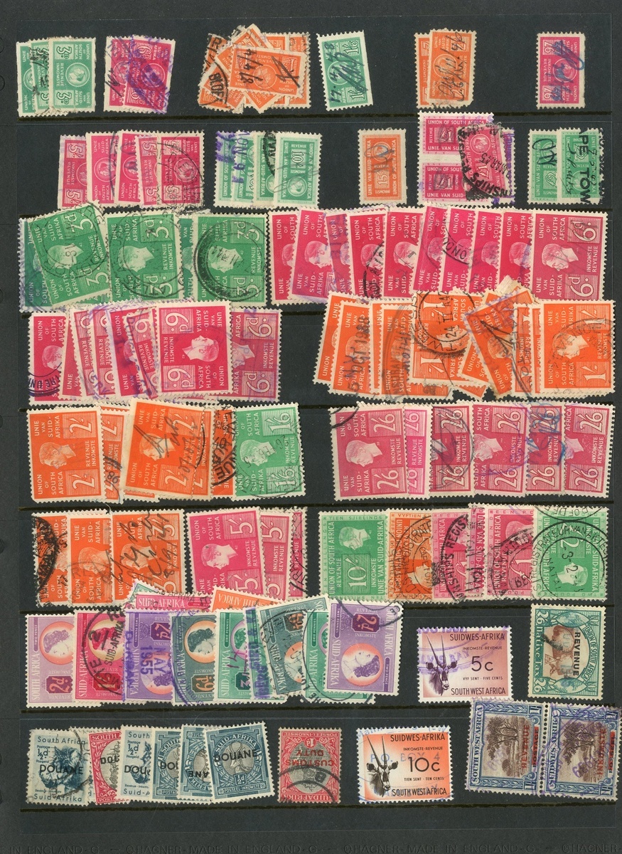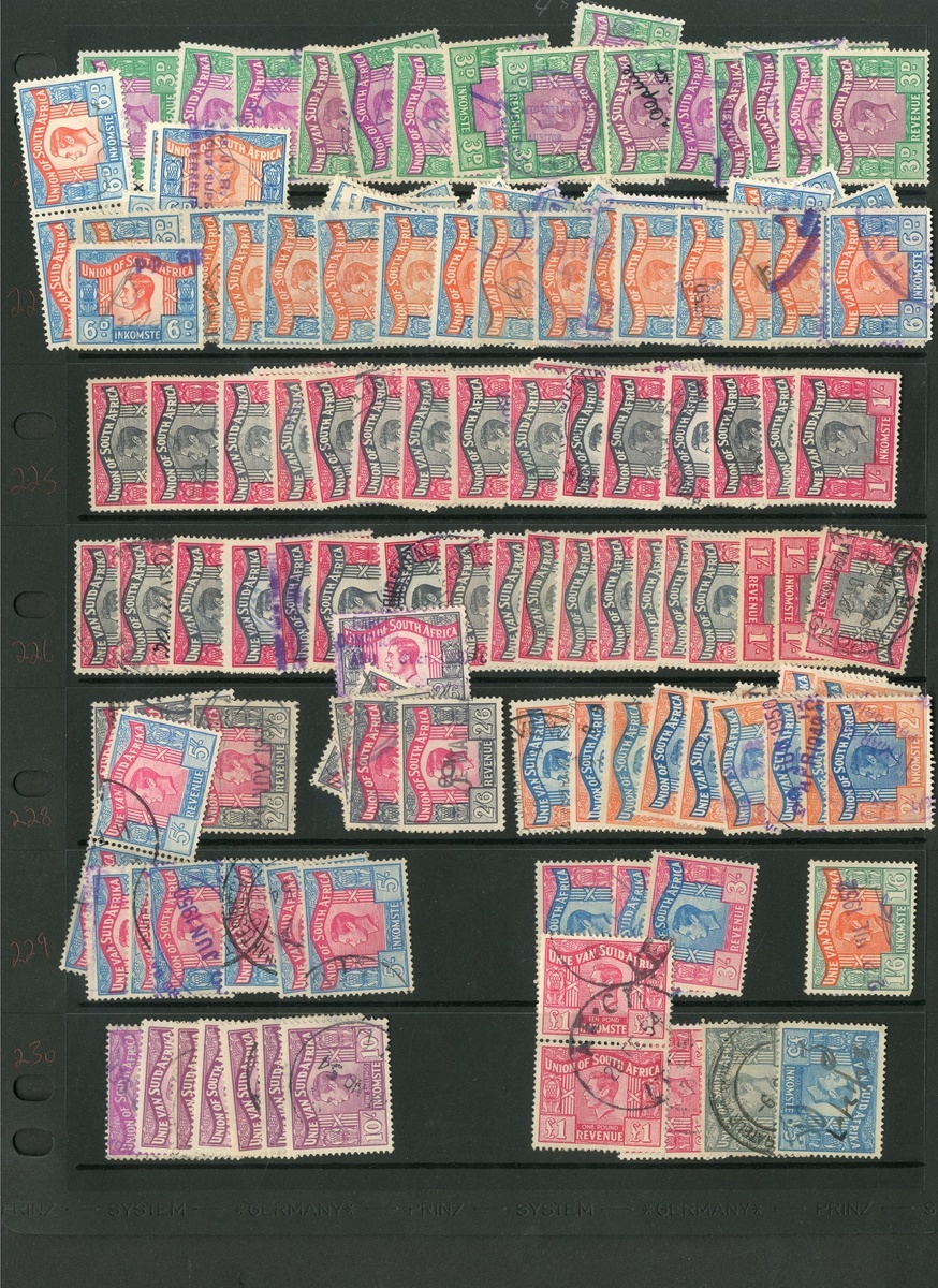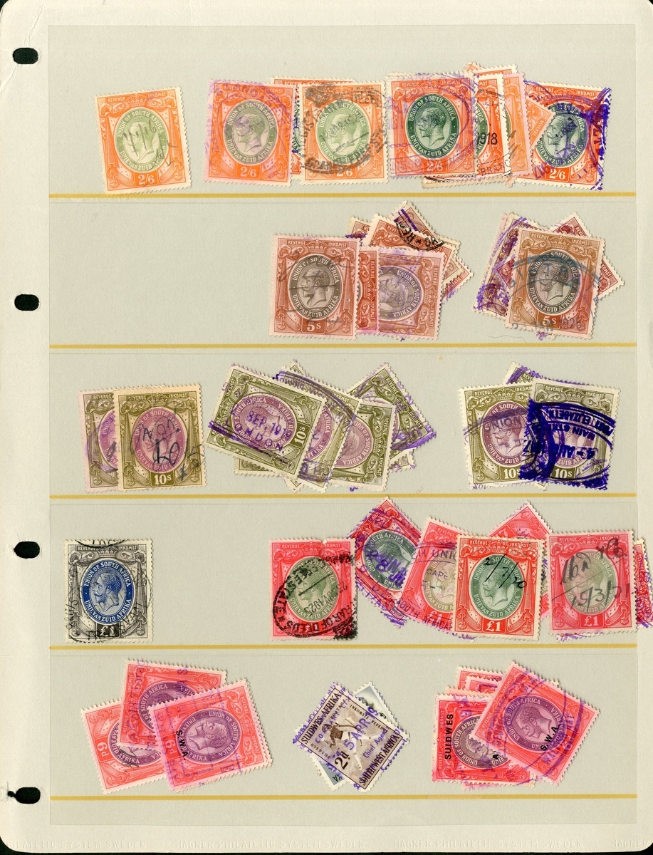 Collection on pages stock sheets and loose (1000+) including fine group of Consular overprints with KGV and KGV values to 10/-, KGVI values to £1, 1954 arms overprints to £1, large selection of Customs Duty mounted and in glassine bag, KGV and KGVI revenue issues arranged by year with extensive ranges on stock sheets, also small selection of South West Africa Revenue overprints pictorial issues to 20/-, KGV overprints to £1 with selection of Cigarette tax (8) overprints on 1931 pictorials. A substantial collection with rare material dotted throughout.