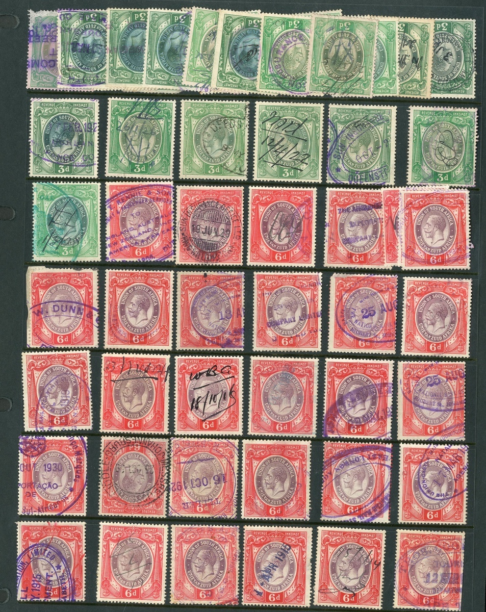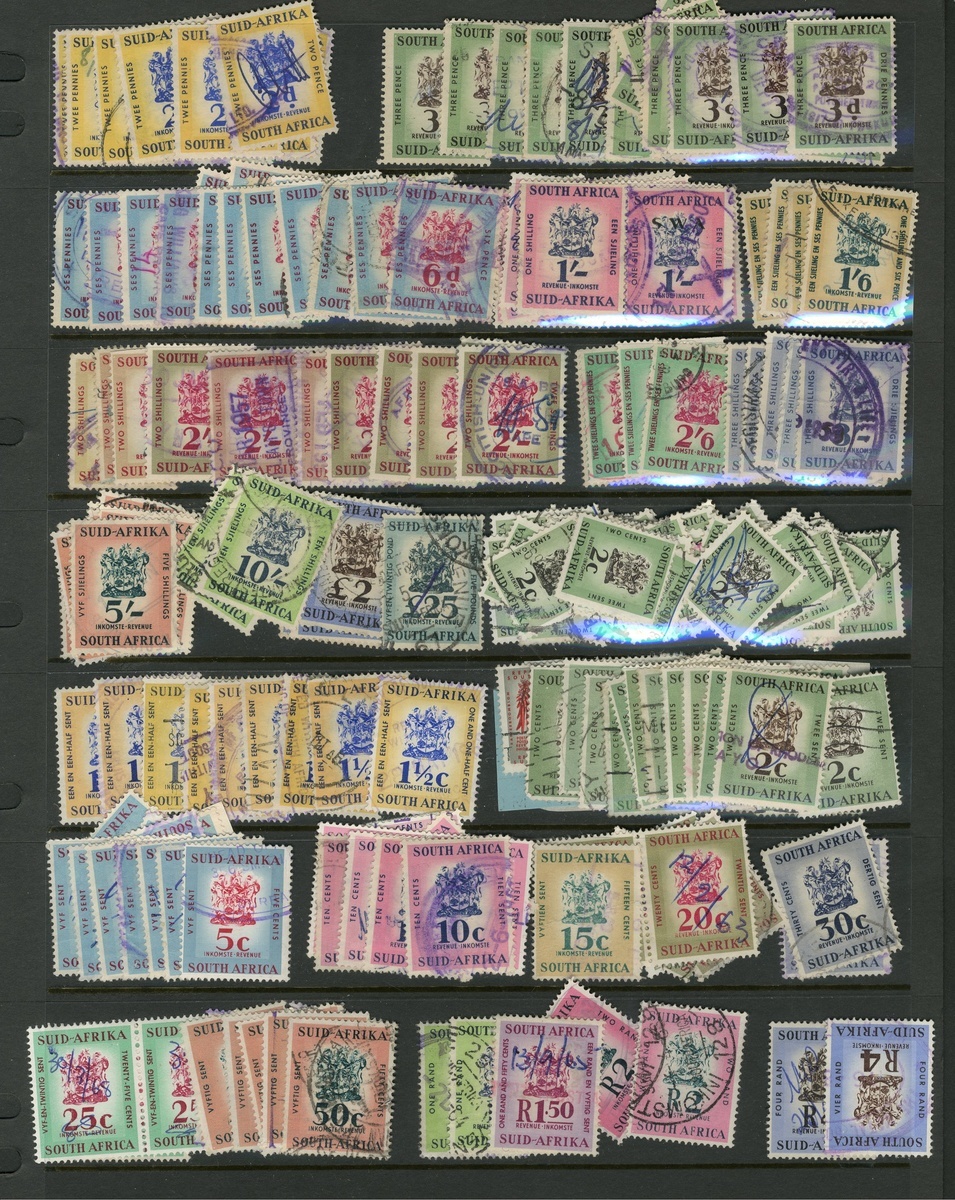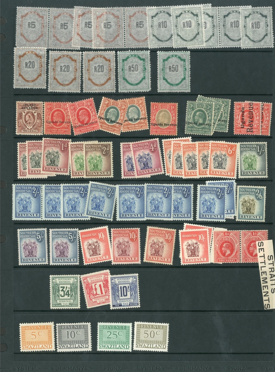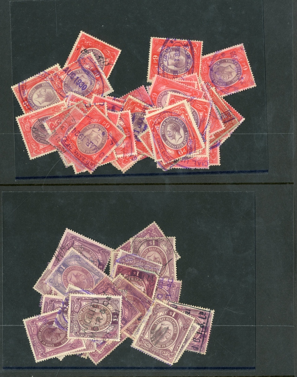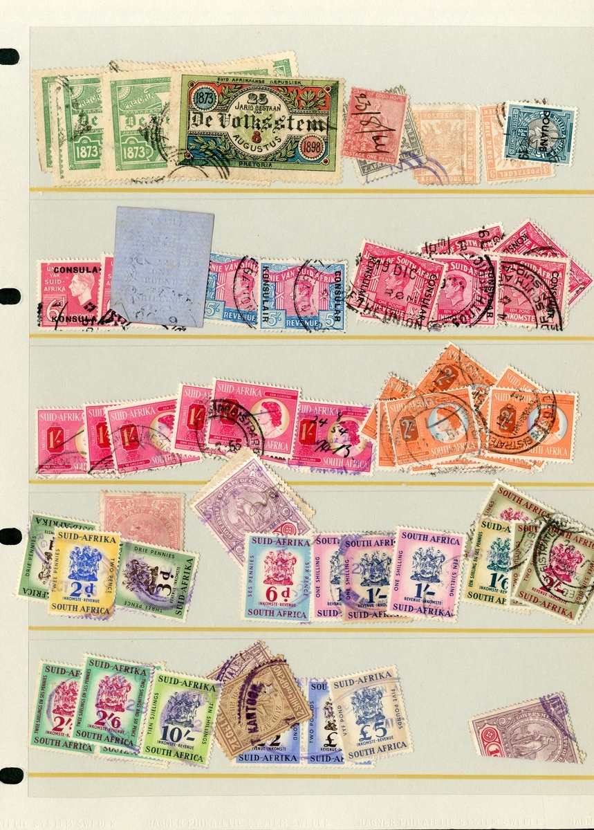 Collection on pages stock sheets and loose (1000+) including fine group of Consular overprints with KGV and KGV values to 10/-, KGVI values to £1, 1954 arms overprints to £1, large selection of Customs Duty mounted and in glassine bag, KGV and KGVI revenue issues arranged by year with extensive ranges on stock sheets, also small selection of South West Africa Revenue overprints pictorial issues to 20/-, KGV overprints to £1 with selection of Cigarette tax (8) overprints on 1931 pictorials. A substantial collection with rare material dotted throughout.