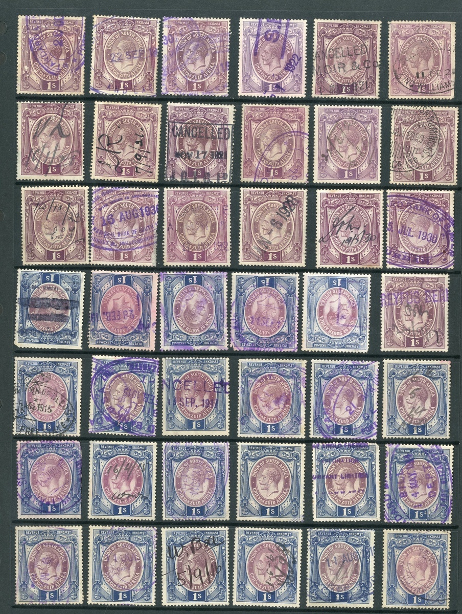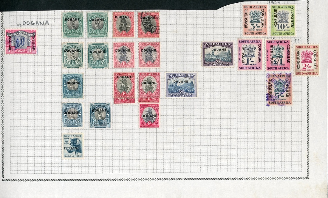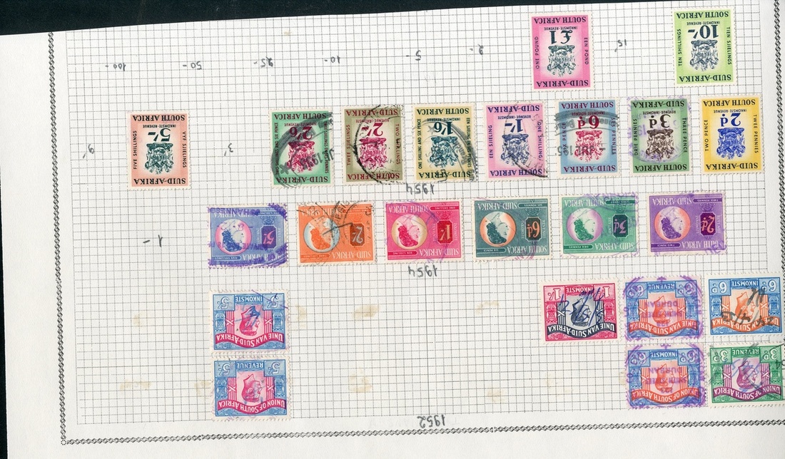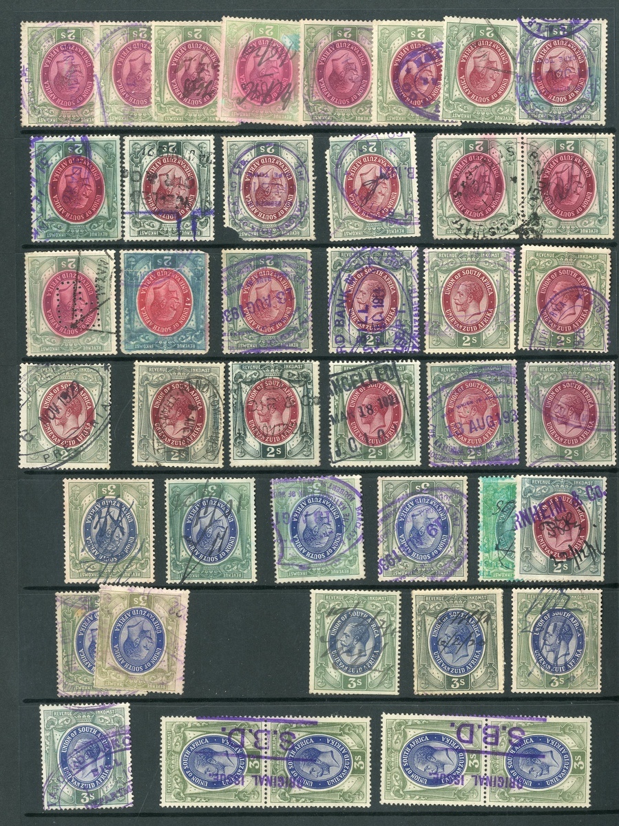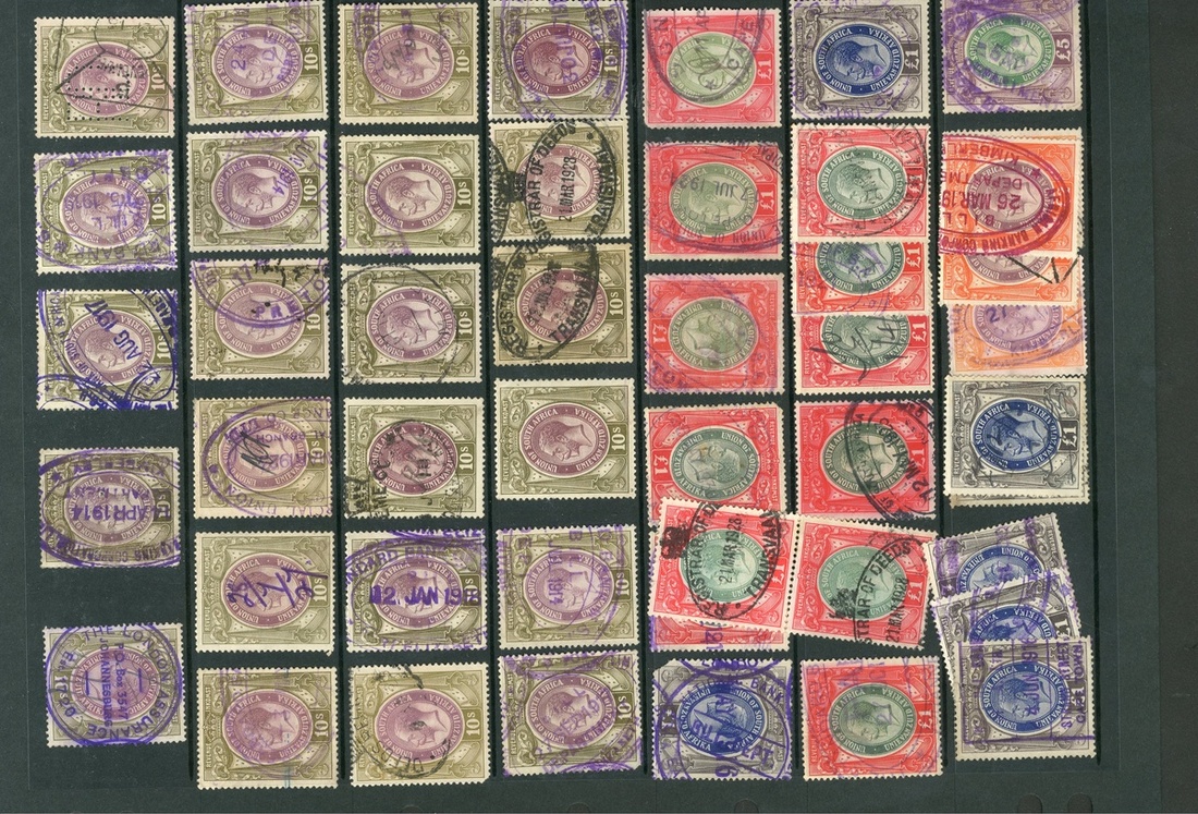 Collection on pages stock sheets and loose (1000+) including fine group of Consular overprints with KGV and KGV values to 10/-, KGVI values to £1, 1954 arms overprints to £1, large selection of Customs Duty mounted and in glassine bag, KGV and KGVI revenue issues arranged by year with extensive ranges on stock sheets, also small selection of South West Africa Revenue overprints pictorial issues to 20/-, KGV overprints to £1 with selection of Cigarette tax (8) overprints on 1931 pictorials. A substantial collection with rare material dotted throughout.