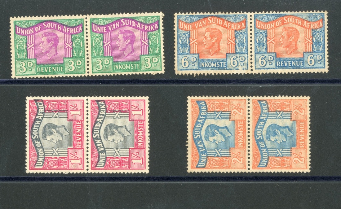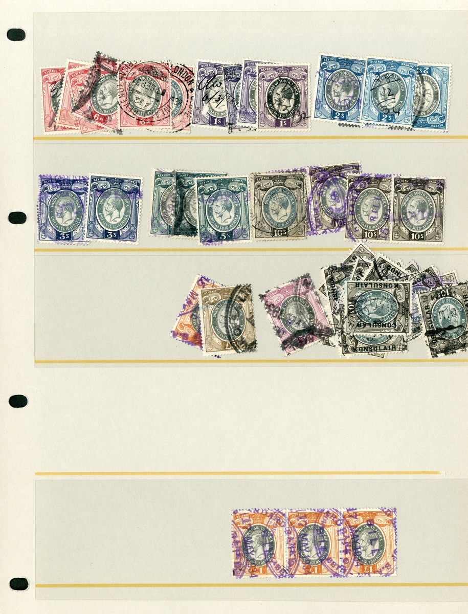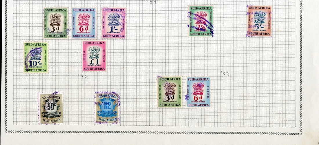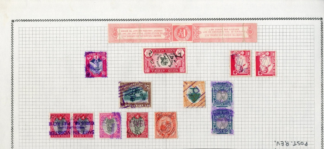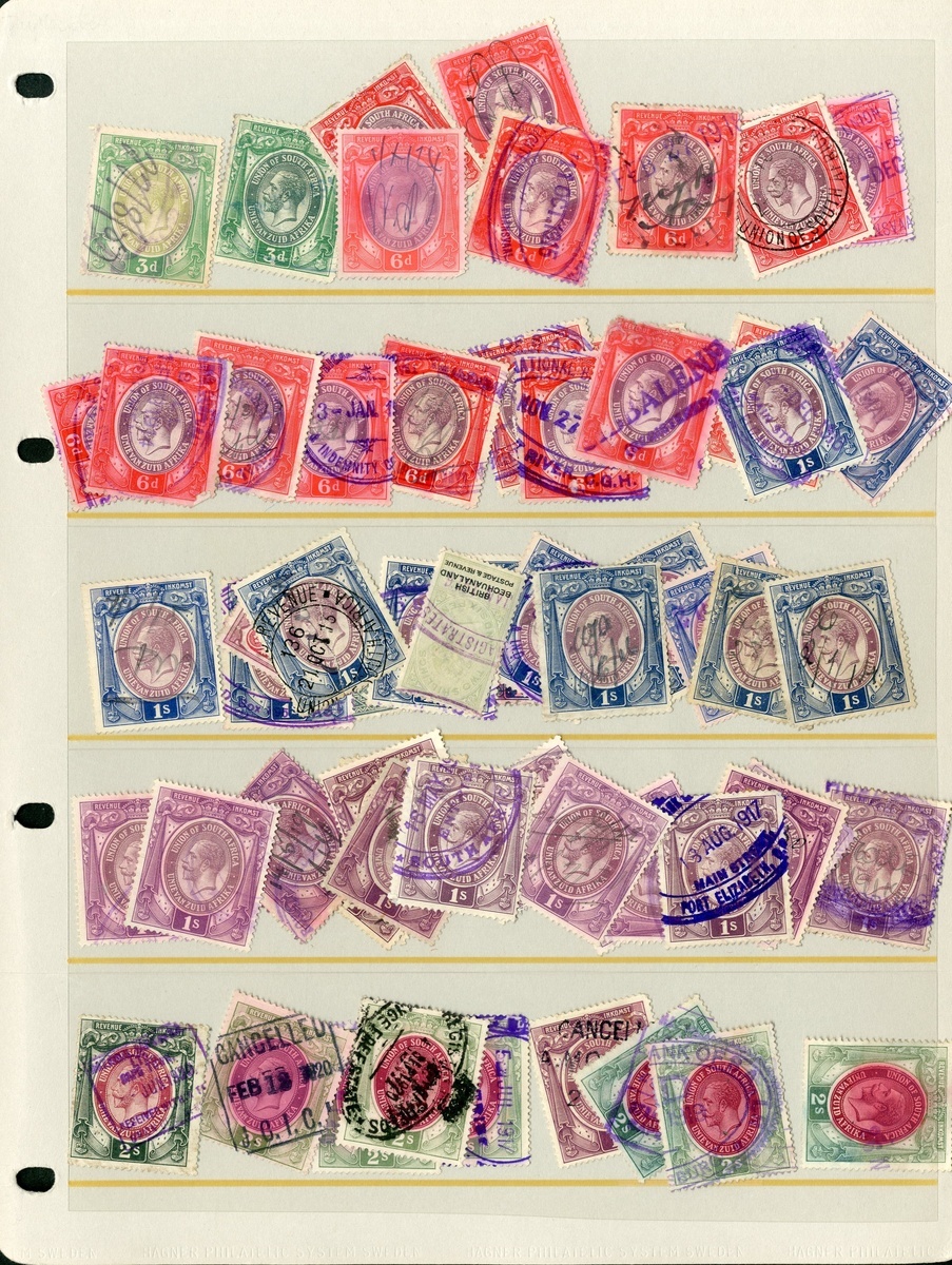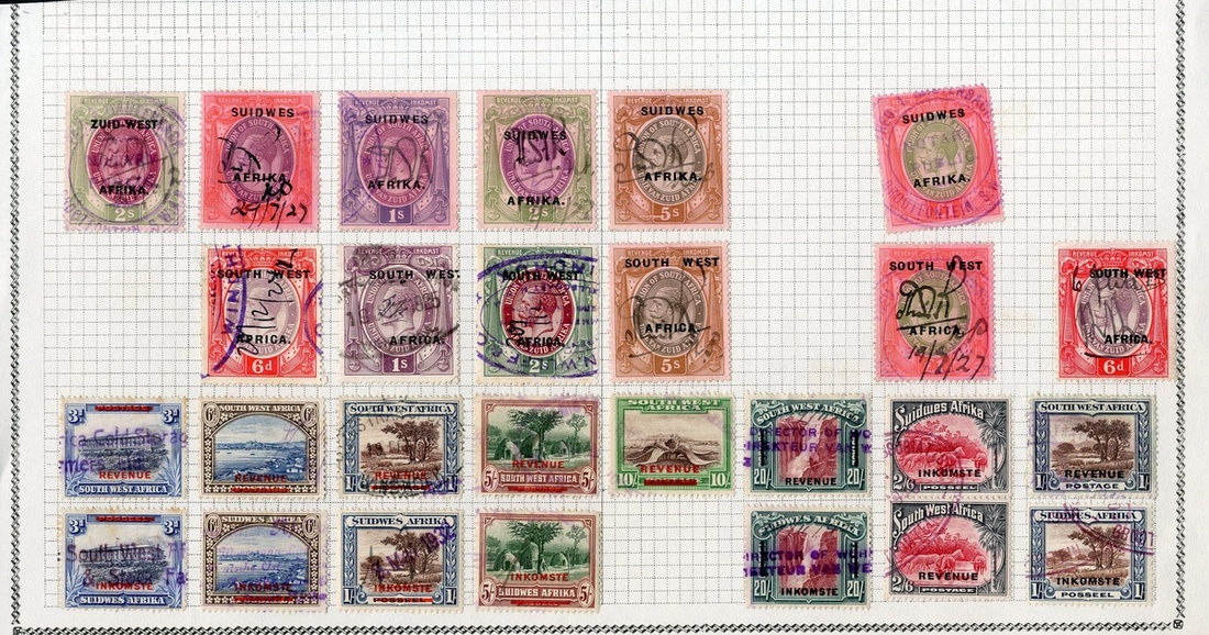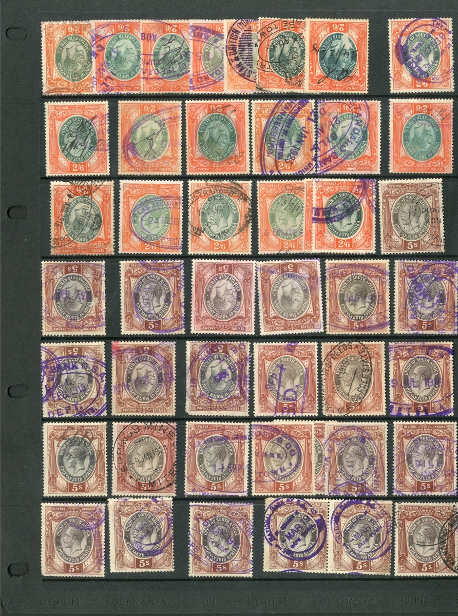 Collection on pages stock sheets and loose (1000+) including fine group of Consular overprints with KGV and KGV values to 10/-, KGVI values to £1, 1954 arms overprints to £1, large selection of Customs Duty mounted and in glassine bag, KGV and KGVI revenue issues arranged by year with extensive ranges on stock sheets, also small selection of South West Africa Revenue overprints pictorial issues to 20/-, KGV overprints to £1 with selection of Cigarette tax (8) overprints on 1931 pictorials. A substantial collection with rare material dotted throughout.