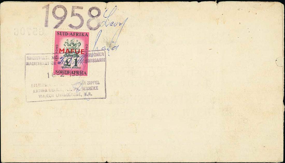 1958-81Group of Registration certificates (8), and labels (4) the key pieces of which are three registration cards, each bearing Arms £1 deep green and pink overprinted mafue" sans-serif in red, each with a different cancel, two dated 1958, the other 1962. the other five certificates showing a wide variety of label colours and types, some recording very late payment of the tribal tax. A very rare collection from this tiny tribe which had only 3003 tax payers in 1955, the £1 particularly elusive. Photo