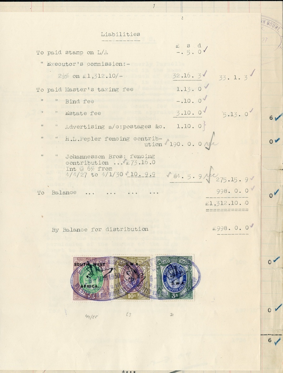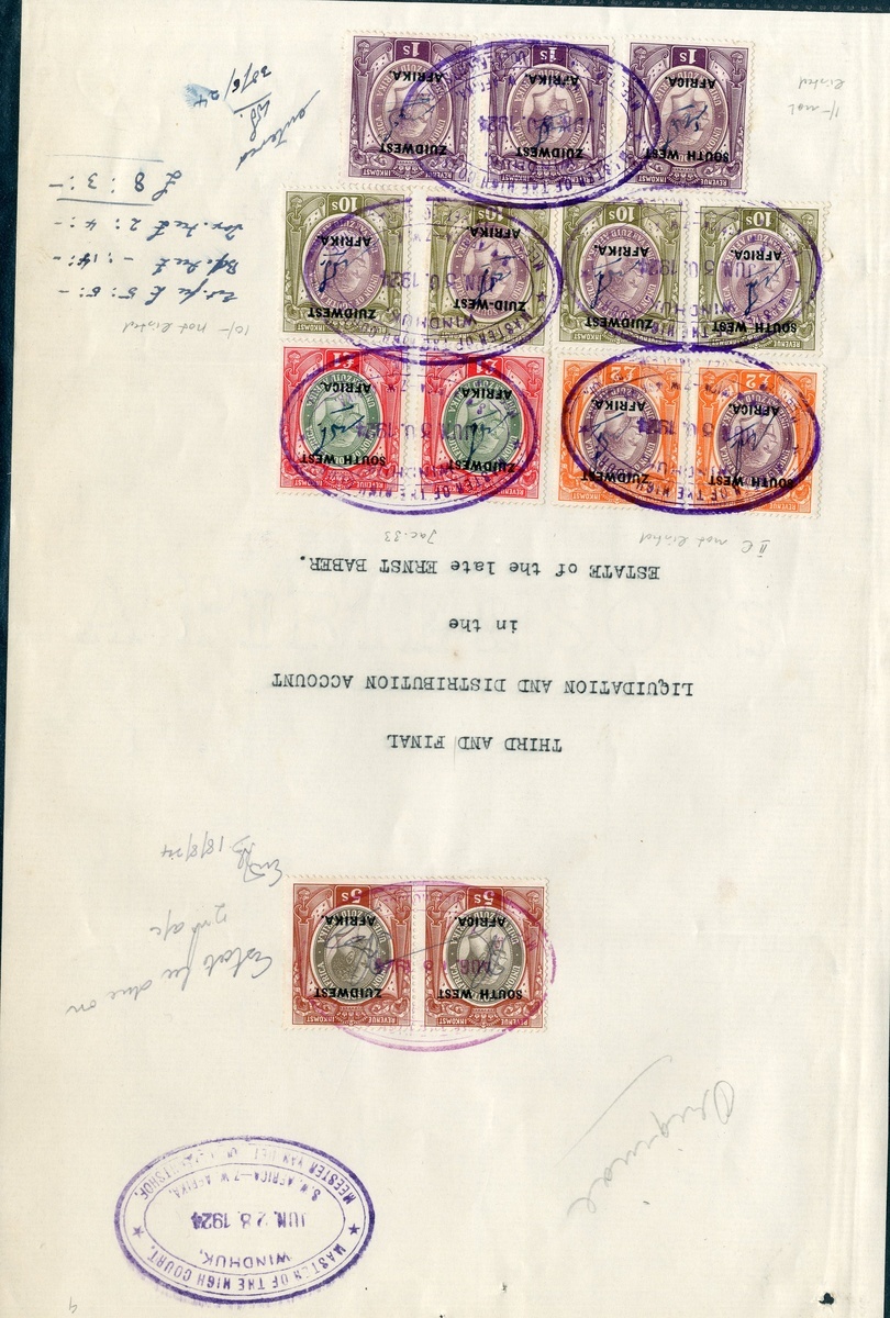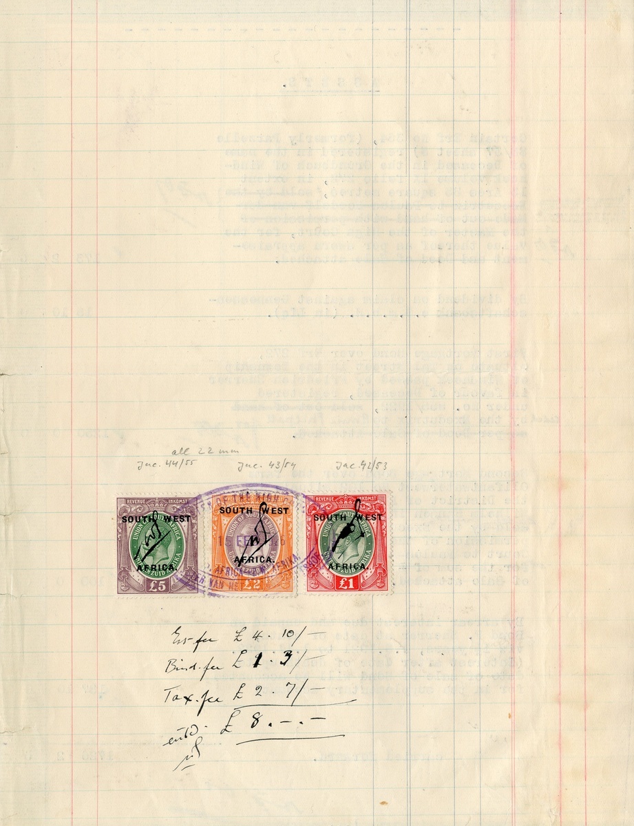 Small group of document pages (5) all franked with this difficult issue including company registration bearing 5/- bi-lingual pair, estate liquidation bearing 5/- bi-lingual pair and £2, (2), £1 (2), 10/- (4), and 1/- (3), the remaining documents showing various mixed frankings but including 3/- bi-;lingual pair and values to £1. A fine lot.