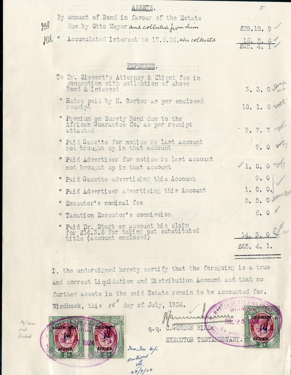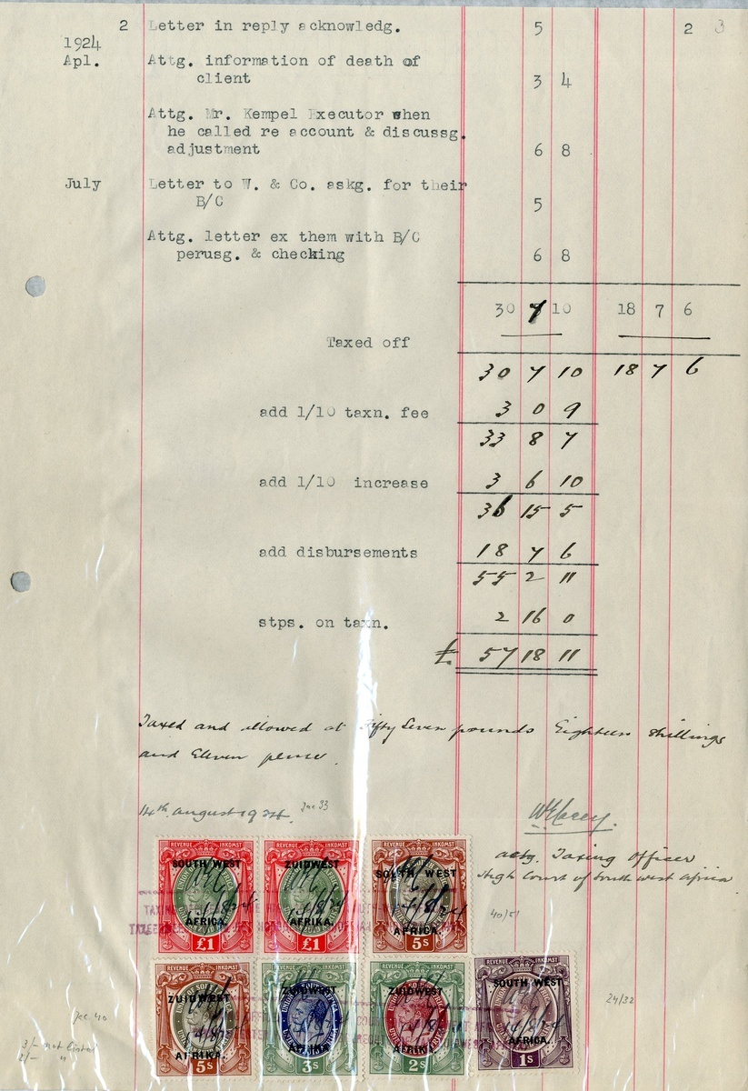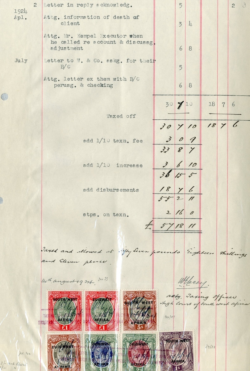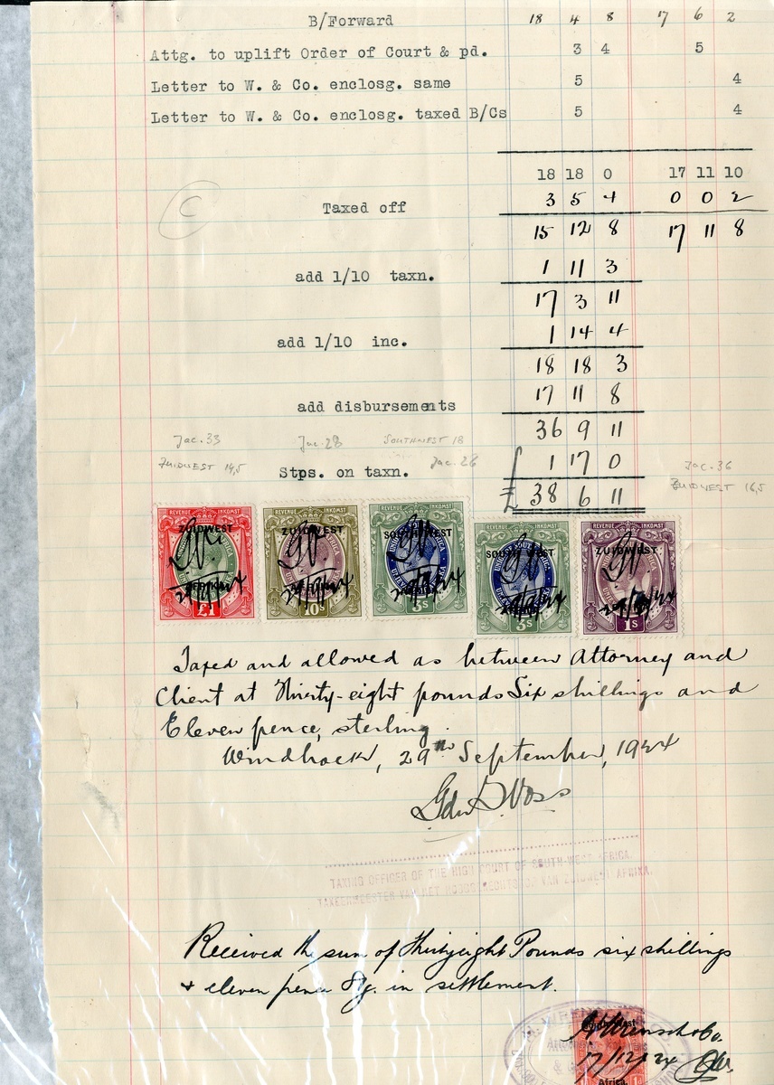 Small group of document pages (5) all franked with this difficult issue including company registration bearing 5/- bi-lingual pair, estate liquidation bearing 5/- bi-lingual pair and £2, (2), £1 (2), 10/- (4), and 1/- (3), the remaining documents showing various mixed frankings but including 3/- bi-;lingual pair and values to £1. A fine lot.