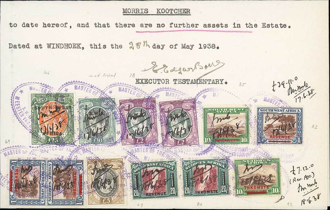 1938 (17 June) estate document page bearing £25 orange and green, small format £10, £5 and £2 (2), overprinted "s.w.a." and 1931 Postage 20/- (2), 10/- (2) and 1/- (3), overprinted 'Revenue' or 'Inkomste' with bars ruled through postage, all cancelled with initials and dated in manuscript. A marvellous and very rare franking, with both the £25 and small format £10 elusive. Photo