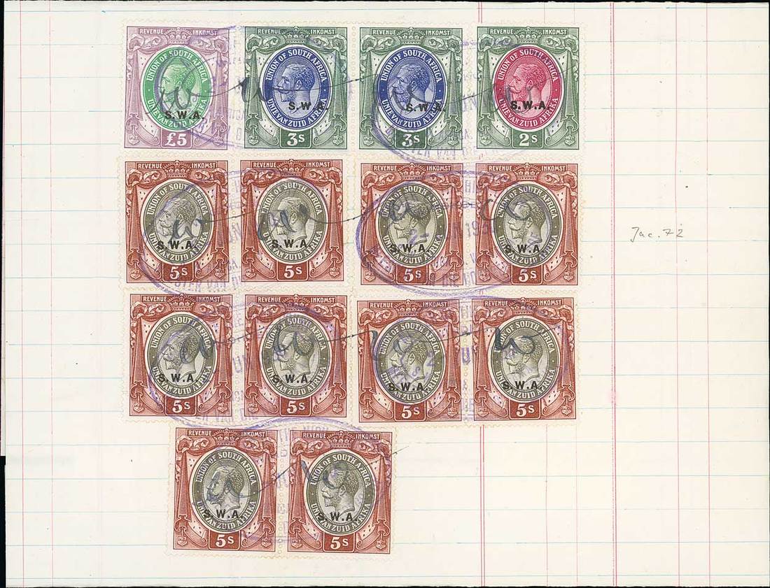 Collection of document pages (25), containing all recorded values, (highest values £5 for opt. at foot, £2 for overprint at top) the vast majority in high value or combination frankings, noted 10/-, 5/- and 3/- used in combination with Third opt. £10, 5/- with 'no stop' variety, combination usage with Cape and Austrian revenues, numerous blocks multiples and pairs, plus a remarkable franking containing 6d. (47) and 1/- (11) all on same page!