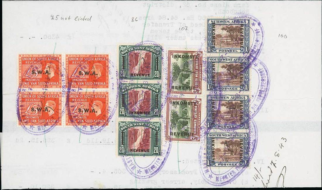 1943 (7 Aug.) page from liquidation document, the reverse bearing £5 orange block of four, used in combination with Series 3 20/- (3), 5/- (2) and 1/- (4), each cancelled by bi-lingual "master of the high court" d.s. in violet and green crayon. A spectacular franking. Photo.