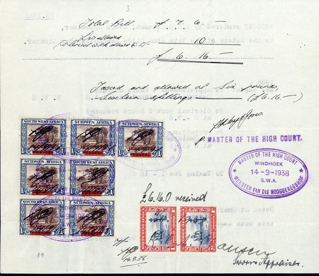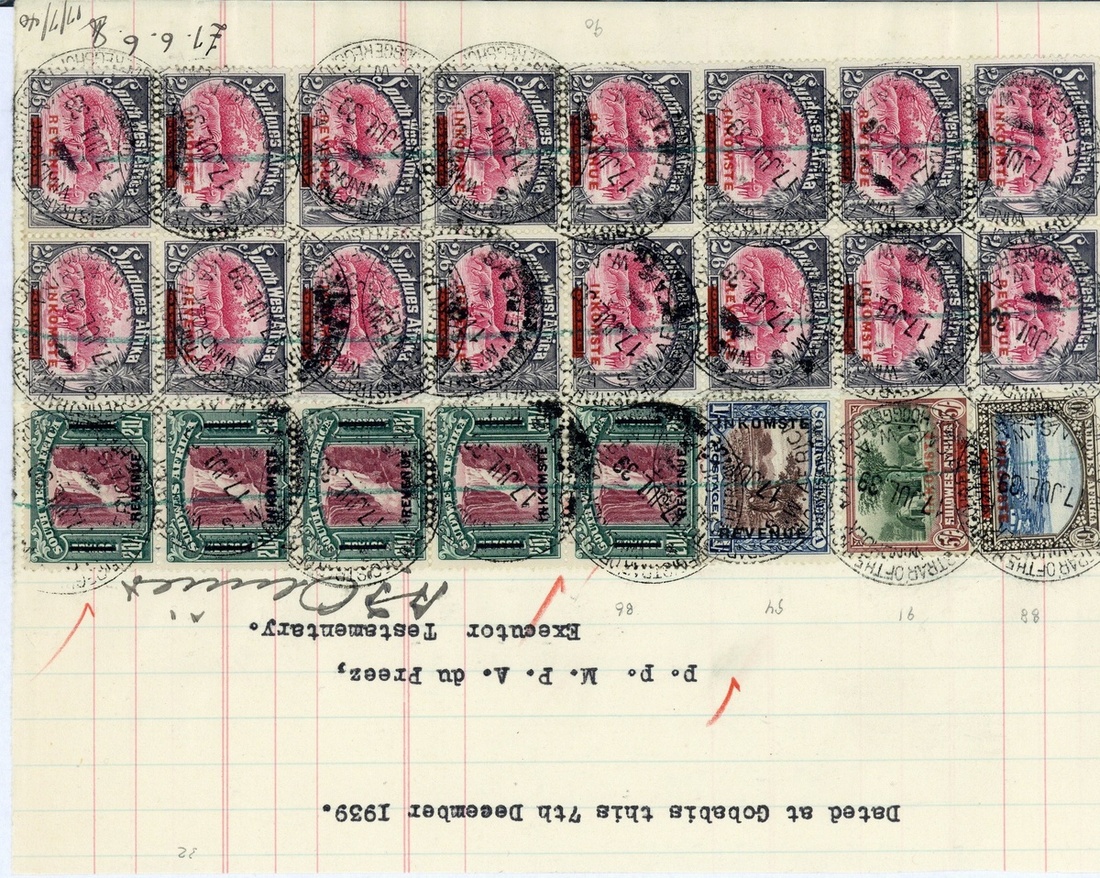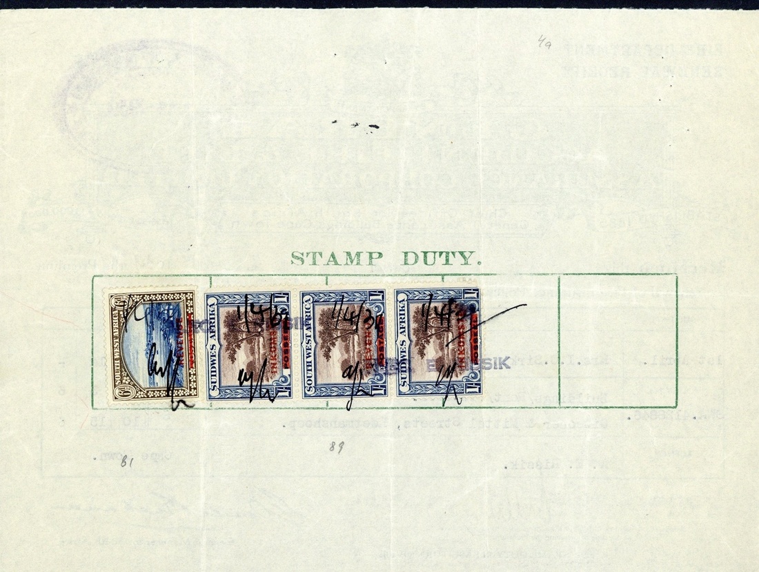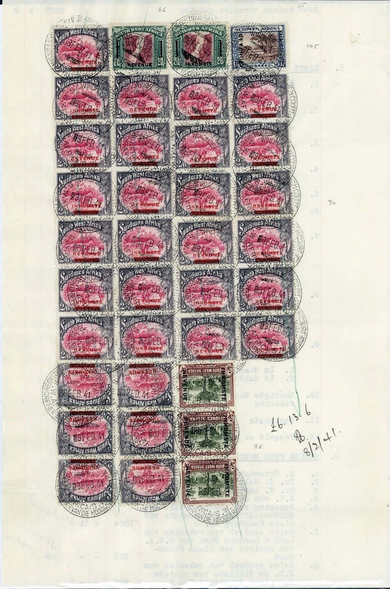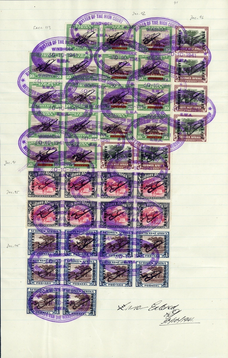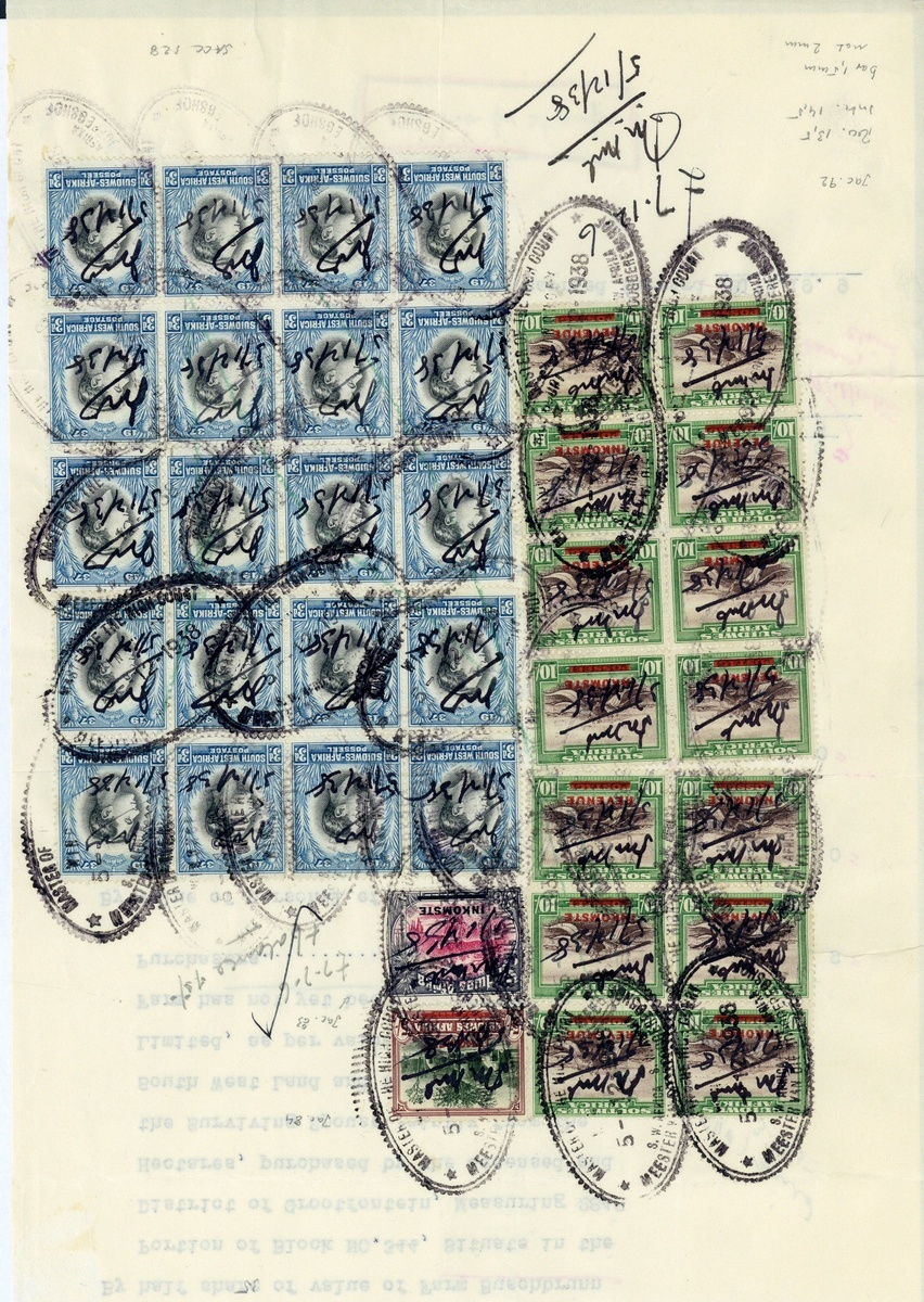 Group of document pages (10) variously franked including 1/- purple and purple (13) including bi-lingual pairs (5), 2/6d. green/orange, and 5/- grey and brown, (14) including block of nine, and a bi-lingual pair, showing a range of South West Africa overprints and settings. Fine.